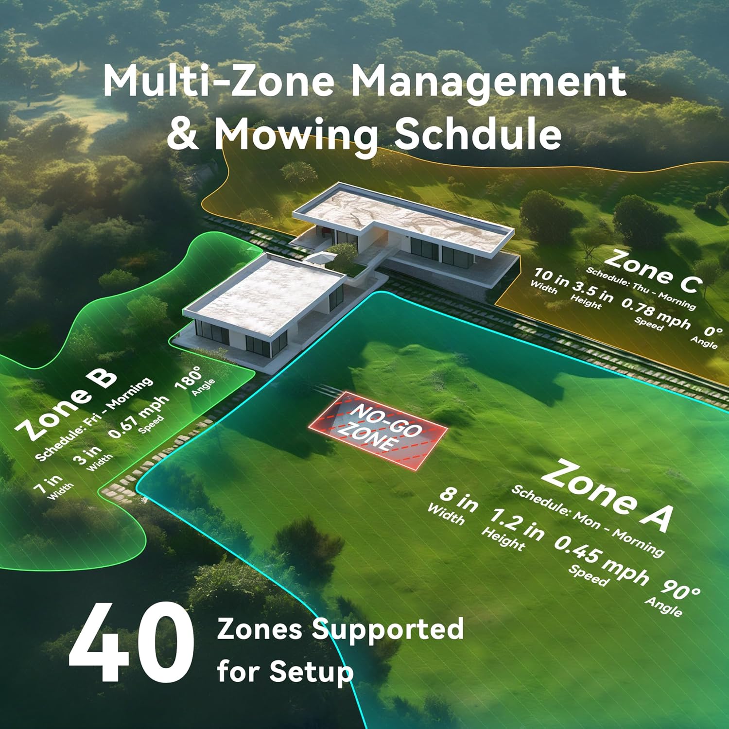 - 【0.75 Acre. Yes. Just One Mower】Thanks to powerful vision and spatial fusion technology, the mower can "understand" its surroundings like human eyes. It supports edge mapping of up to 0.75 acre (32,670 sq.ft / 3000㎡) and ensures consistently centimeter-accurate positioning. Users can customize 40 working areas via the app and define no-go zones such as pools, flower beds, and play areas, all of which are accurately recognized. Daily lawn care becomes effortless with the schedule function.
