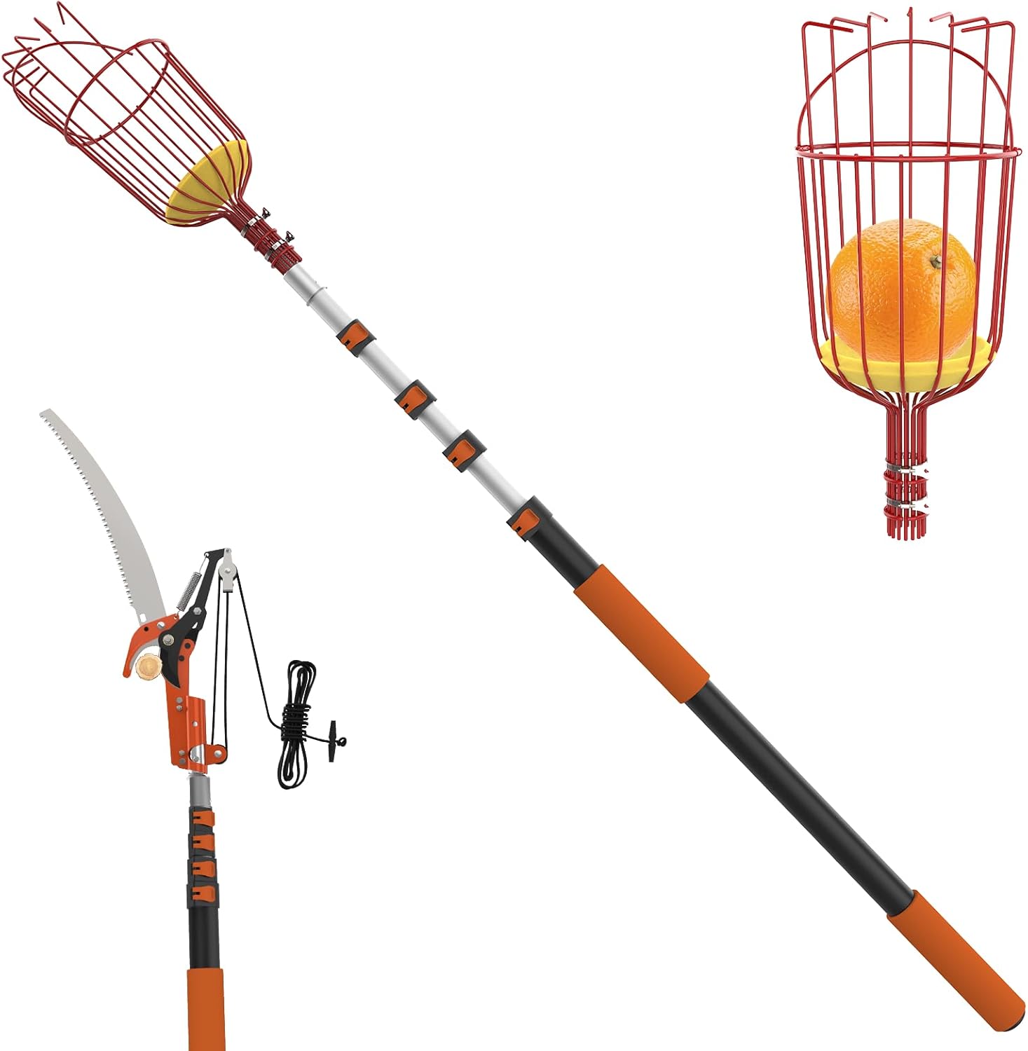20FT Reach Fruit Picker Pole with Basket Telescoping, Apple Picker with Tree Trimmer and 3-12FT Extension Pole for Orange Lemon Mango Avocado Guava Fruit Picking