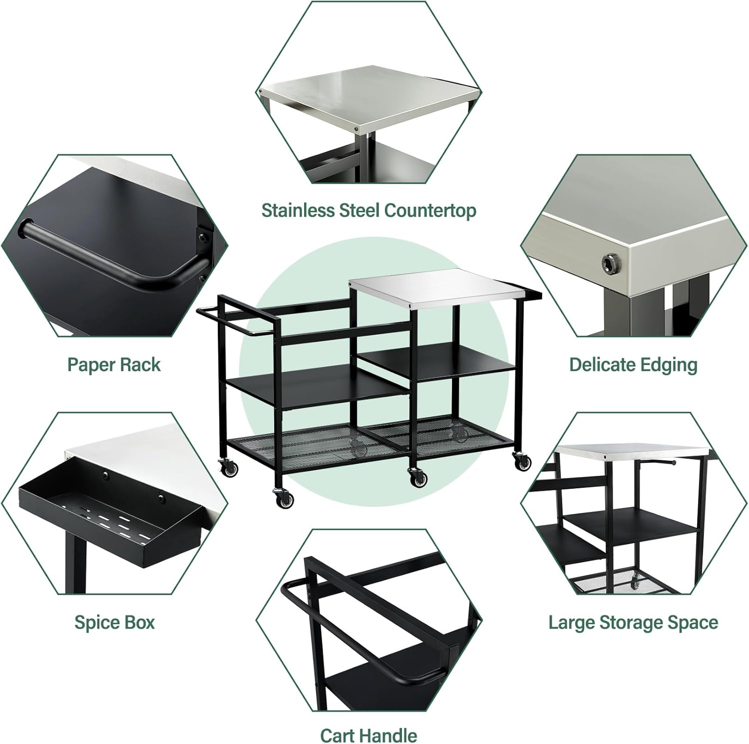 - 【Ample Storage Space】The cart offers versatile storage options. In addition to the stainless steel prep top, it features three big shelves for organizing utensils, ingredients, charcoal, and more. The side is a spice rack and a paper towel holder—so your seasonings and paper are always easy to reach. Everything stays neat and close by, making your cooking easier and more efficient.