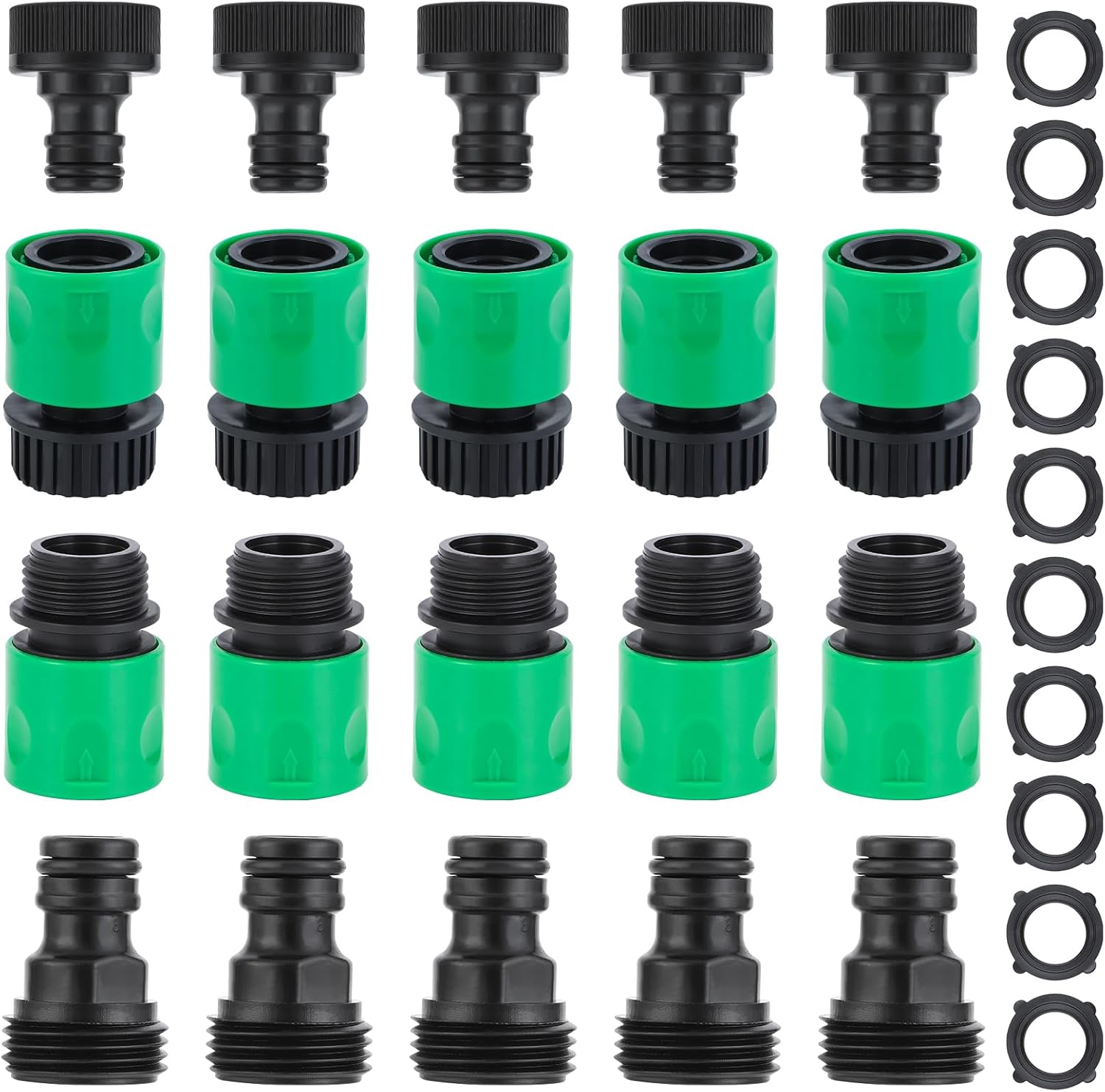 - Package contents: You will receive five female thread hose connectors, five male thread hose adapters, five male thread faucet adapters, five female thread faucet connectors, and 12 rubber gaskets.