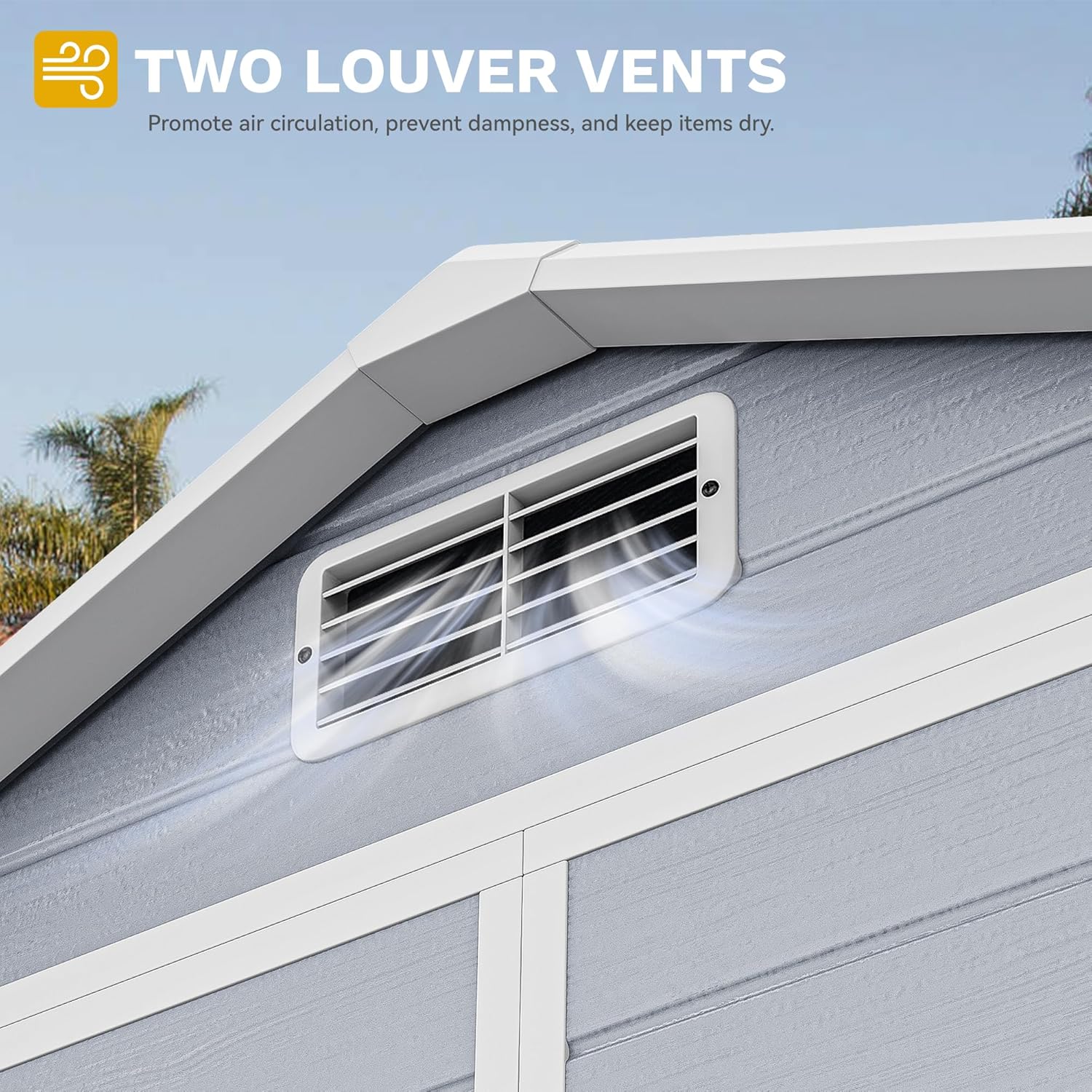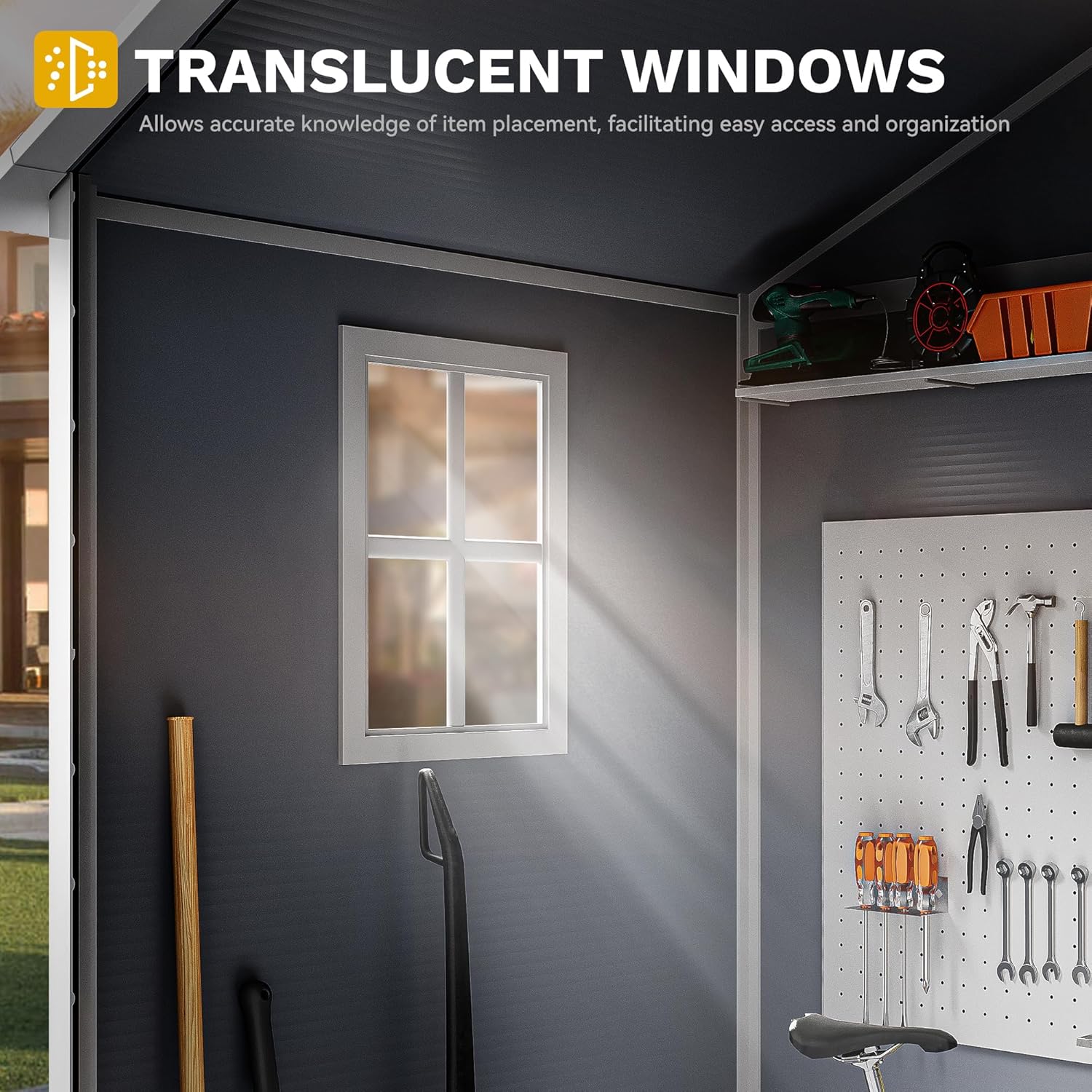 - [Optimal Ventilation & Transparency] The garden tool storage features a lockable door that prevents theft and protects stored items; The transparent side windows allow natural light to illuminate the interior, while the louvered vents promote air circulation and prevent moisture buildup; The sloped roof facilitates drainage, prevents rainwater accumulation and extends the shed’s lifespan