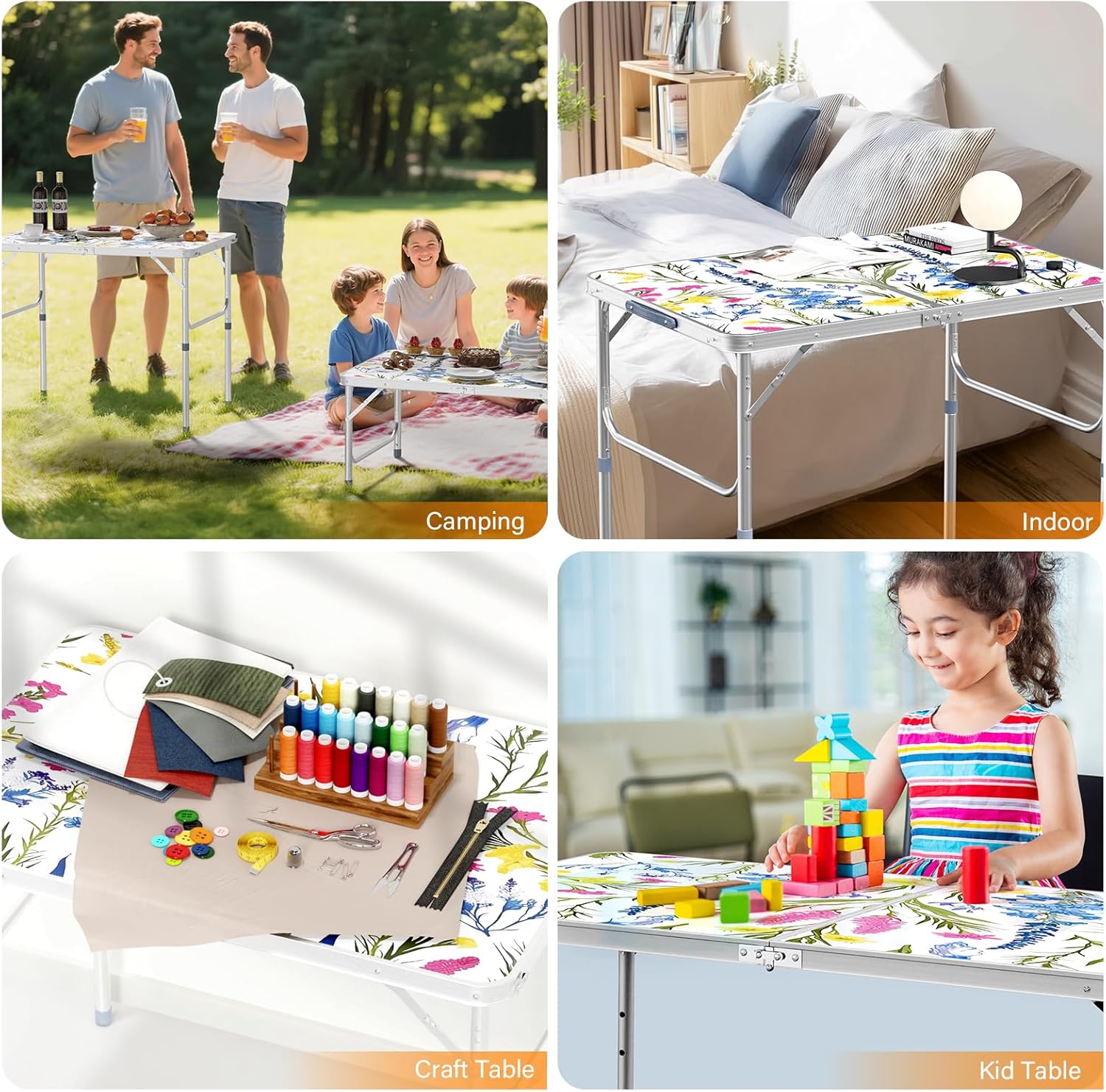 - MULTIPURPOSE TABLE: The foldable table is universal . Perfect for outdoor and indoor activities, camping, picnic, hiking, fishing, Dining, BBQ, party, travel, gathering, concert, sports, event.