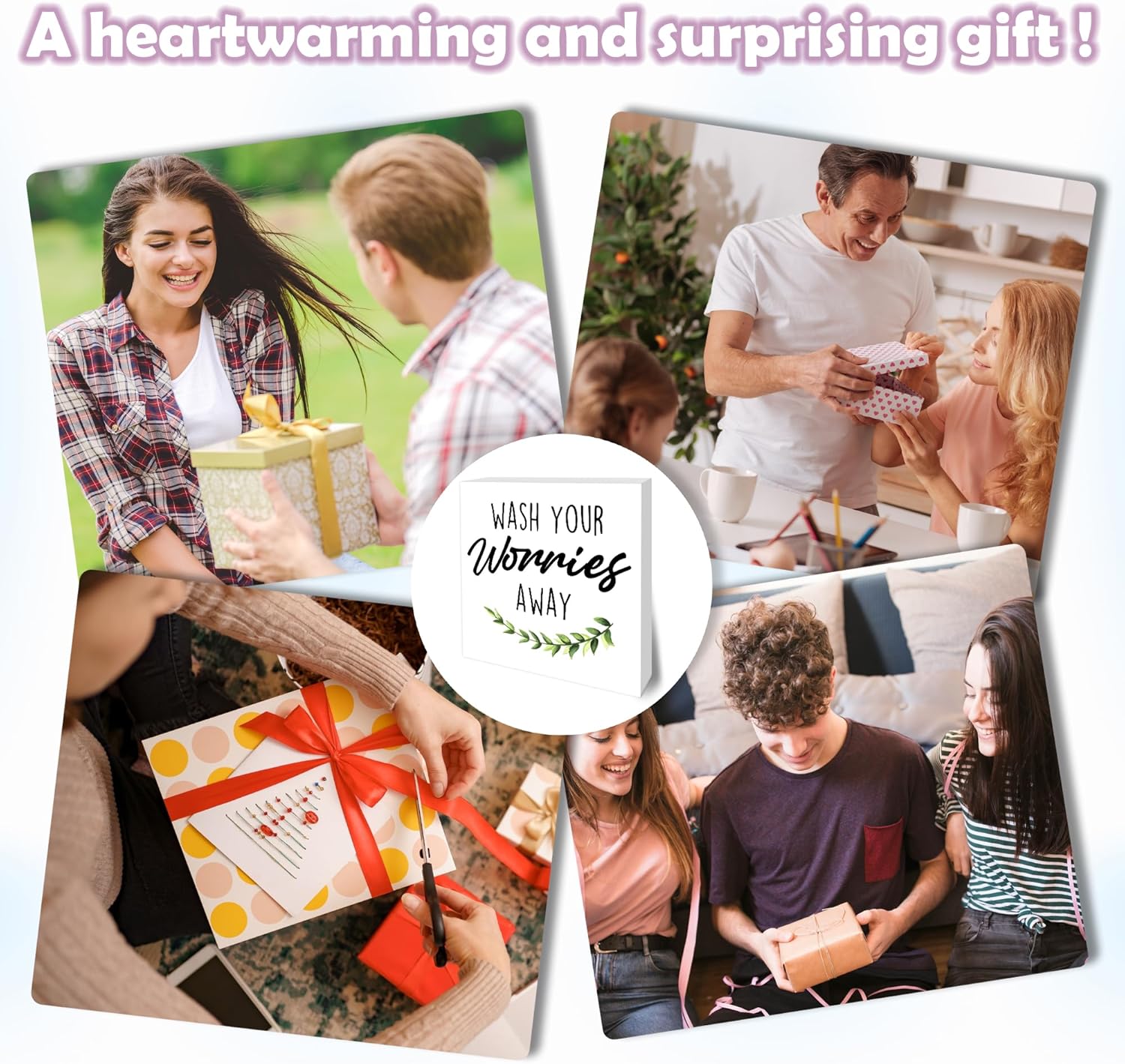 Wash Your Worries Away Wooden Block Sign - 5" Leaves Wooden Plaque Tabletop Decor - Rustic Farmhouse Wood Sign Gifts For Friends Family Coworker- Bathroom Toilets Desk Decor & Supplies -B17