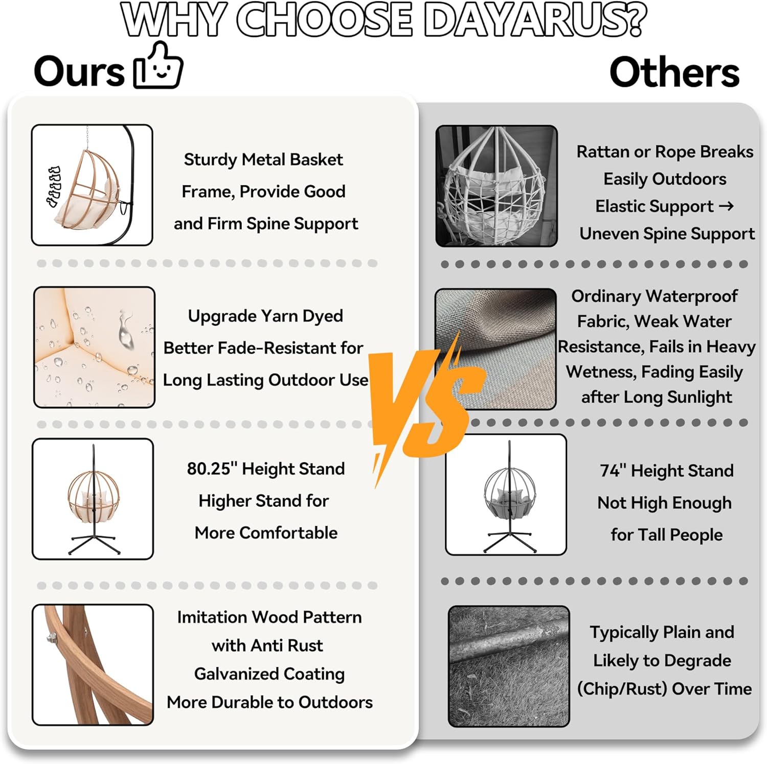 - Easy Care: The swing egg chair features a rust-resistant galvanized metal frame with a smooth, wood-grain finish that repels dust and stains. Simply wipe with a damp cloth to maintain its pristine