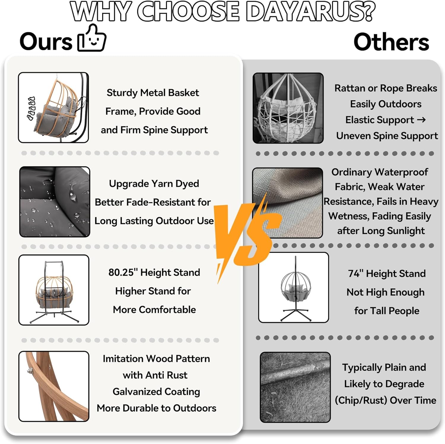 - Upgraded Quality: The outdoor egg chair has a fluffy cushion for soft sitting. its upgraded waterproof fabric resists sun, won't fade, suits all - weather use, and cleans easily, ensuring lasting outdoor use