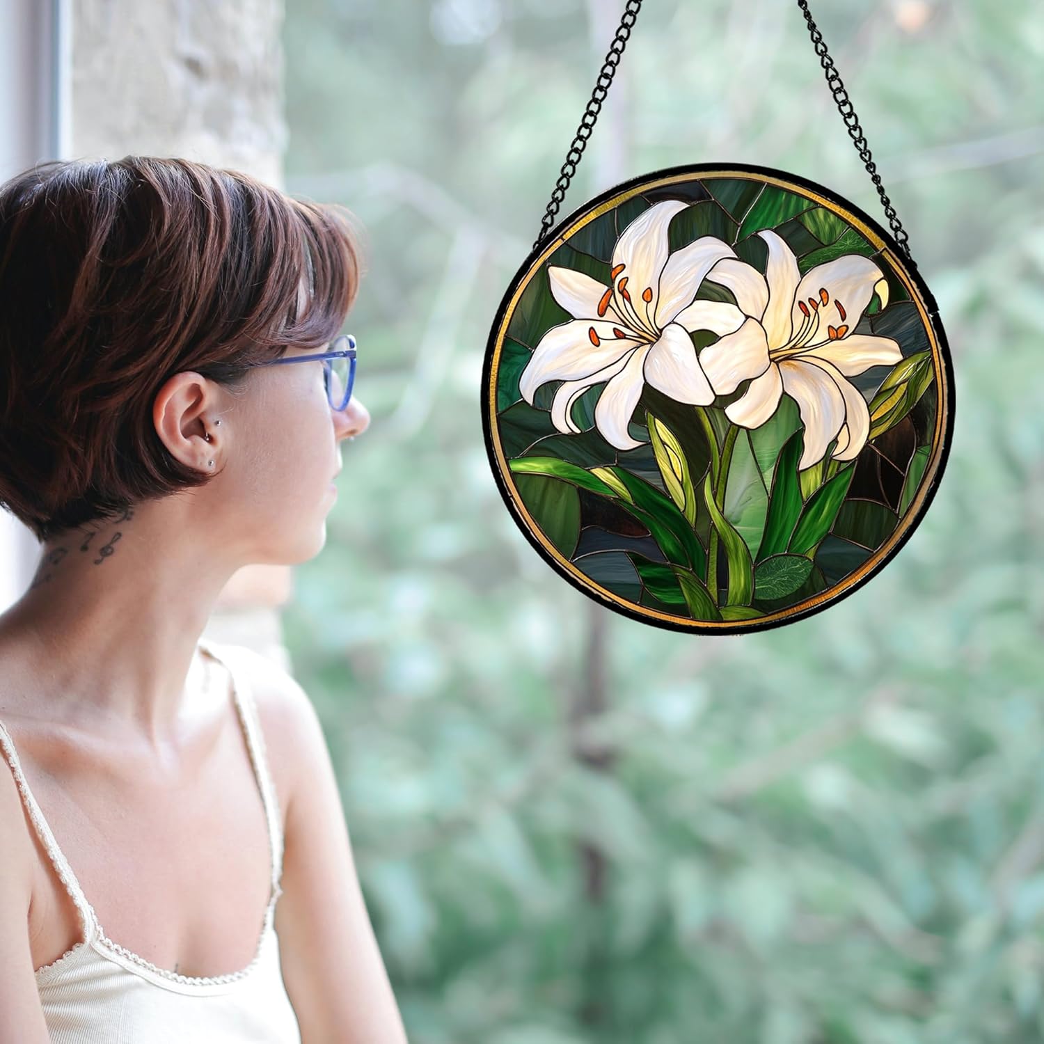 Stained Glass Window Hanging, White Lily Suncatcher for Door Garden Patio Birth Flower Green Plant Sun Catchers Decor Christmas Mother's Day Birthday Gifts for Women Mom Nana Friend 6.3 in