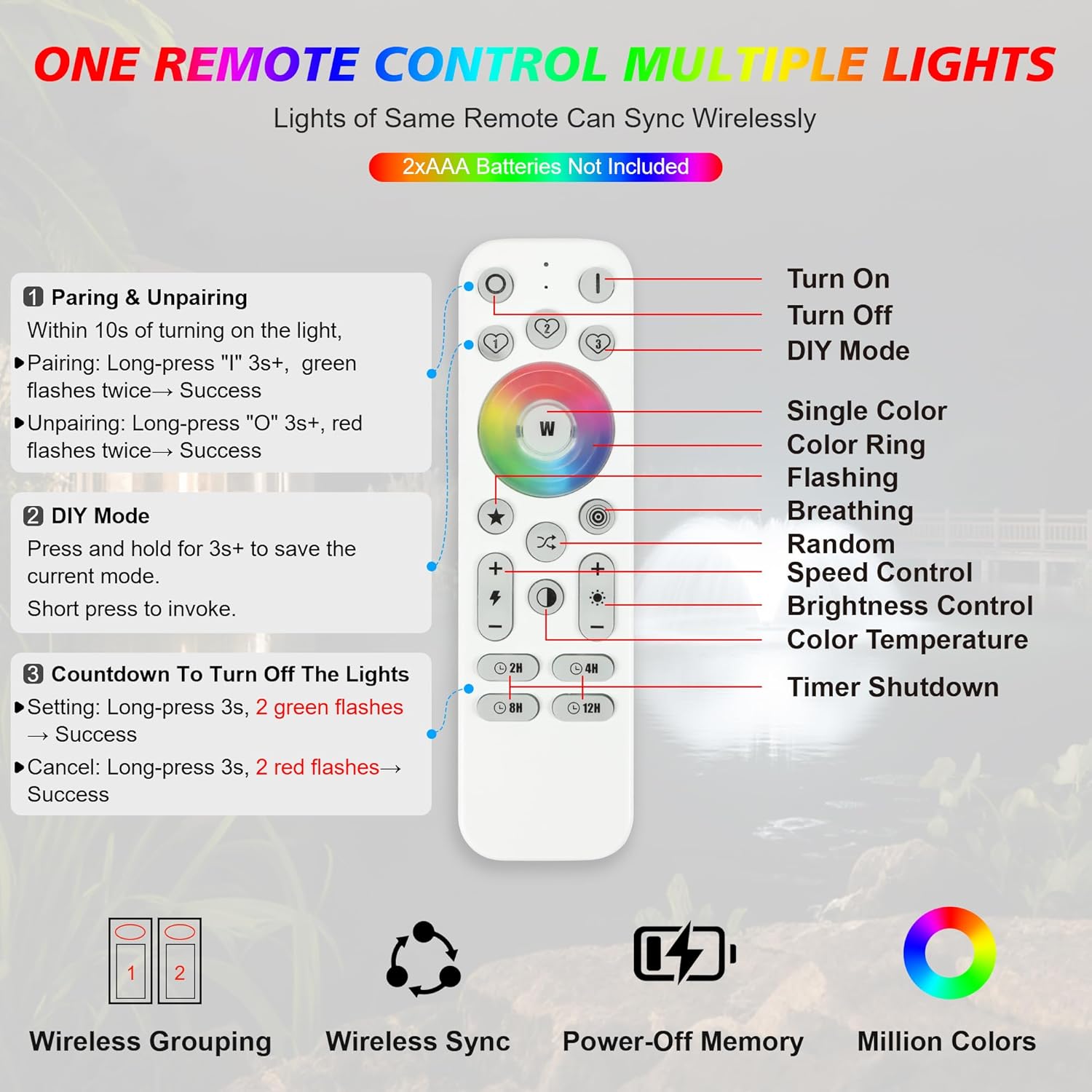 - WIRELESS-SYNC & CUSTOM CONTROL LIGHT: One remote for multiple lights. With power-off memory, DIY million colors; 100 ft signal (extendable) - each light can receive and transmit signals within 100 ft, and will automatically synchronize with other lights. This means you only need to power up, and each light can increase your control distance by 100 ft.