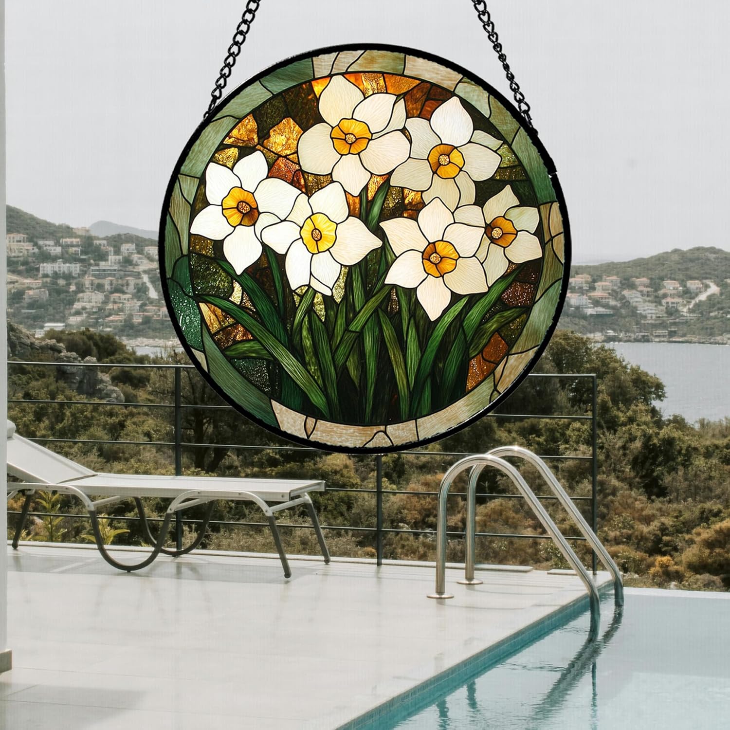 Stained Glass Window Hanging, White Lily Suncatcher for Door Garden Patio Birth Flower Green Plant Sun Catchers Decor Christmas Mother's Day Birthday Gifts for Women Mom Nana Friend 11.8 in