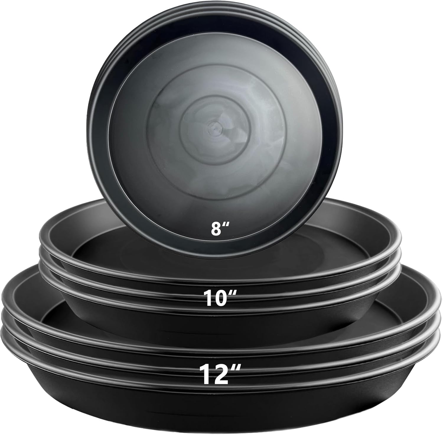 - ă9 Pack Multi-Size Plant Saucersă Includes 9 pcs durable plant saucers: 3 Ă 8 inch (8.27" outer dia, 6.81" inner dia, 1.1" height, 70g each), 3 Ă 10 inch (10.43" outer dia, 8.94" inner dia, 1.18" height, 133g each), and 3 Ă 12 inch (11.61" outer dia, 10.04" inner dia, 1.26" height, 163g each). Suitable for small, medium, and large flower pots. Manual measurement may cause slight differences, but will not affect normal use.