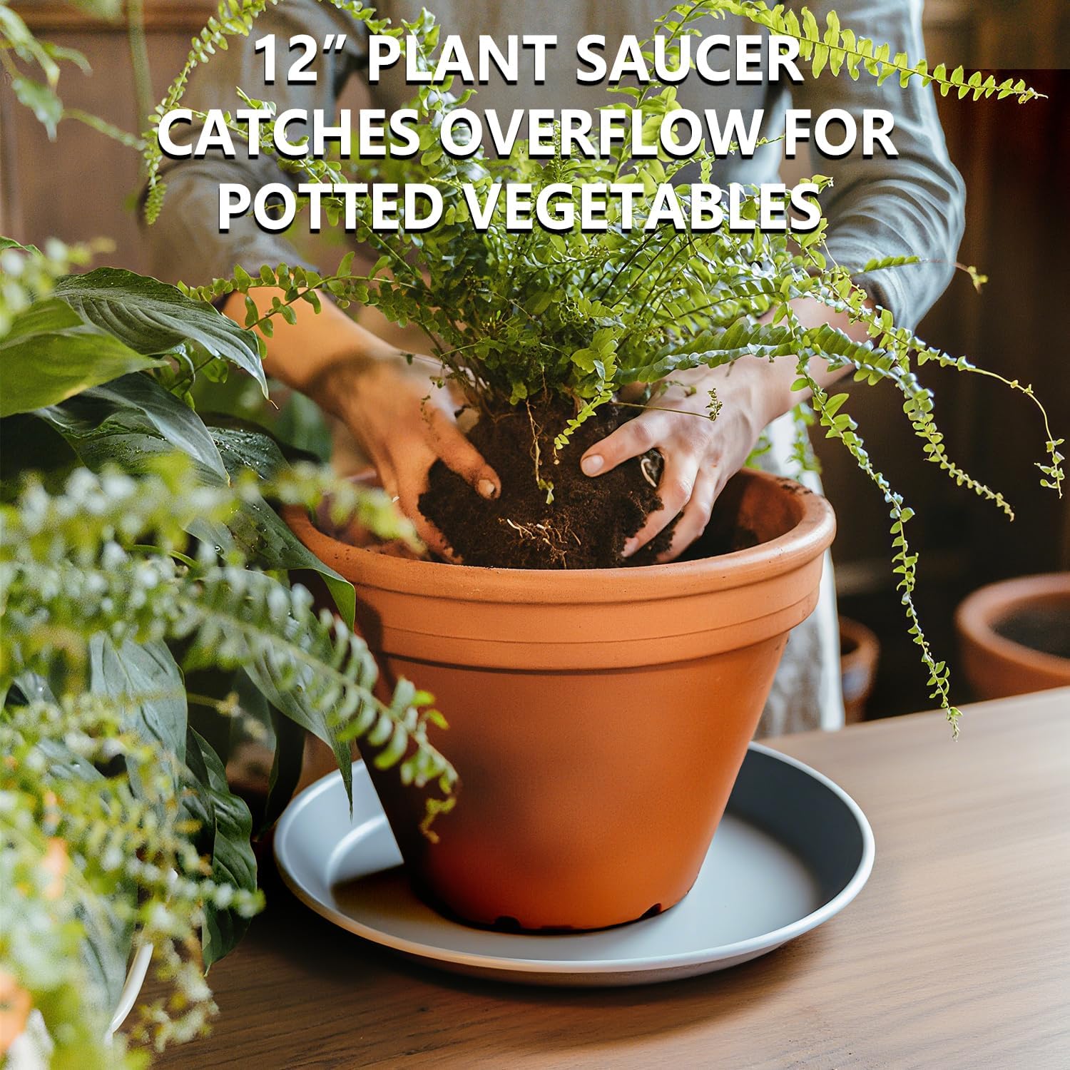 - ă6 Pack 12 Inch Gray Plant Saucersă Includes 6 pcs durable 12 inch round plant saucers, approx. 11.6" outer diameter, 10" inner diameter, 1.25" height, 163 g each. Slight manual measurement differences do not affect normal use.