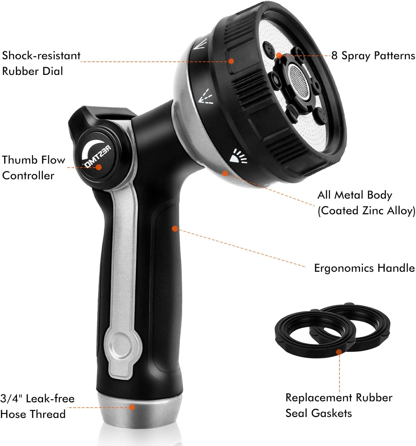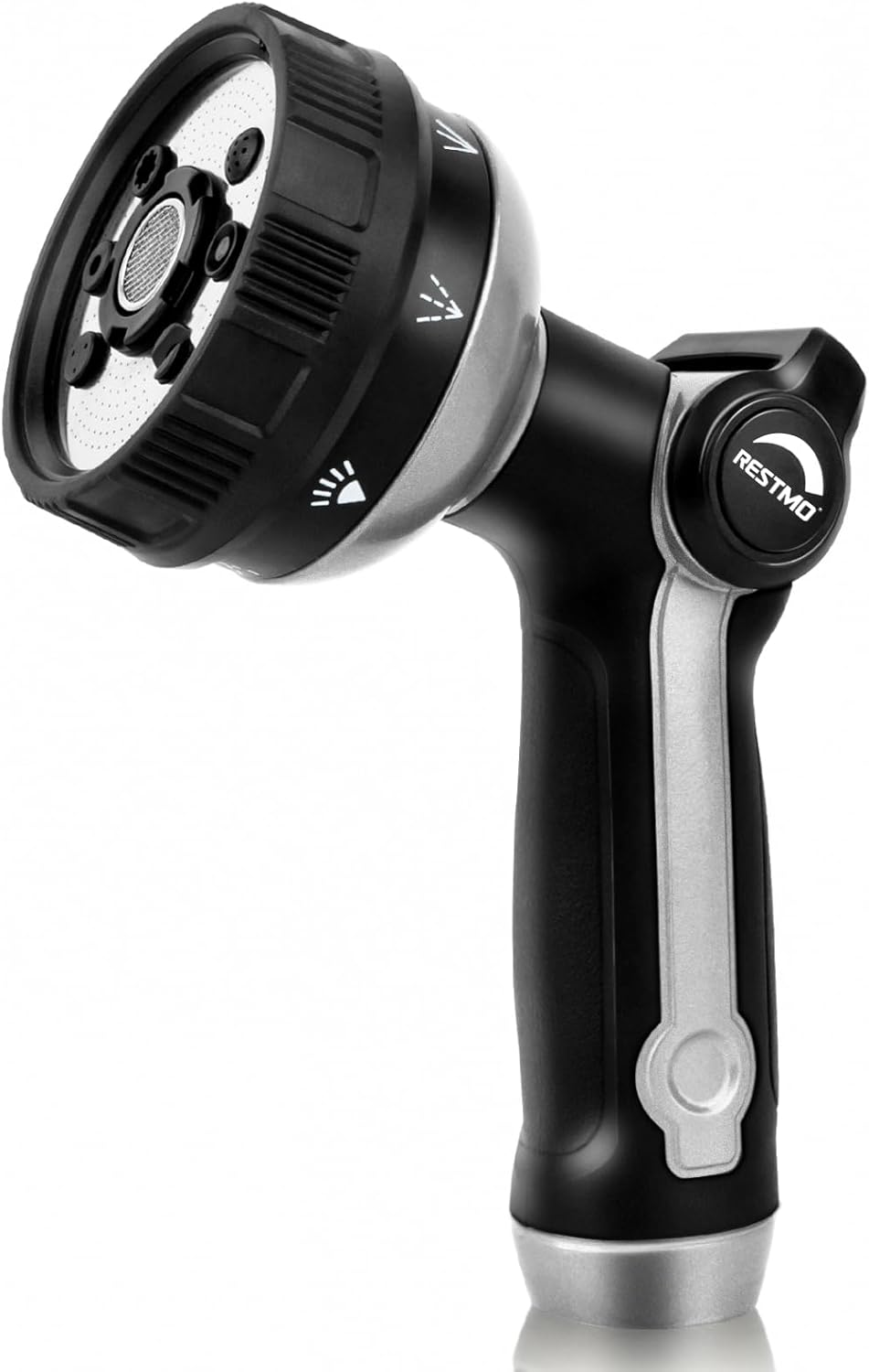 RESTMO Full Shower Hose Nozzle, Metal Spray Nozzle for Garden Hose, 8 Spray Patterns, Water Hose nozzle with Thumb Control, Ideal for Outdoor Lawn & Plant Watering, Car & Pet Washing, Silver