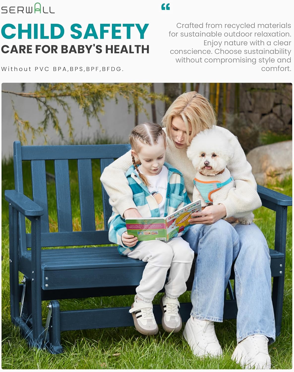 SERWALL Outdoor Glider Bench, HDPE All Weather Swinging Bench for Outdoor Porch Garden, 660LBS Capacity, Navy Blue