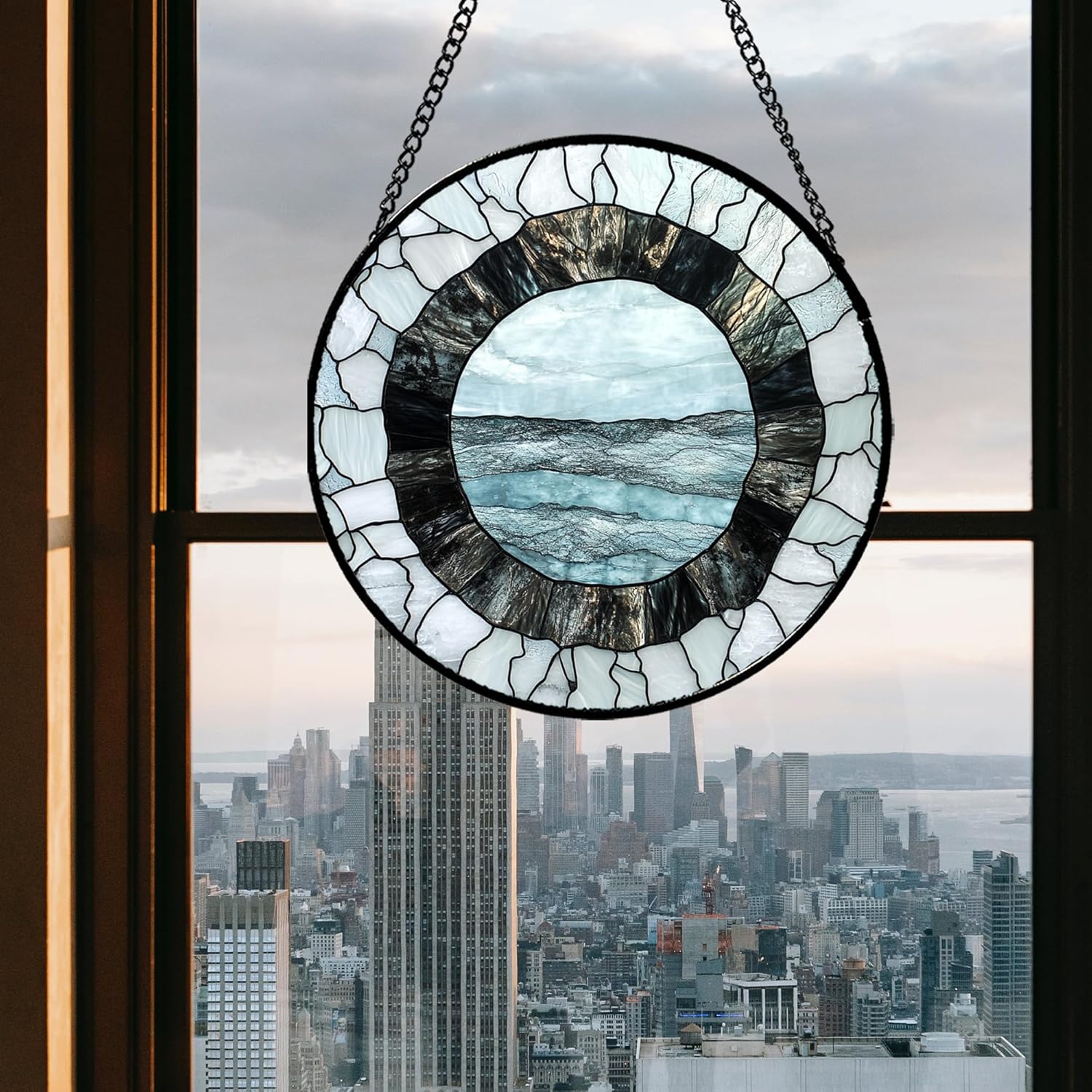 Stained Glass Window Hanging - Abstract Sea Surface Suncatcher for Doors Garden Patio Round Sun Catchers Decor Christmas Mother's Day Birthday Gifts for Women Men Mom Nana Friend 15 in