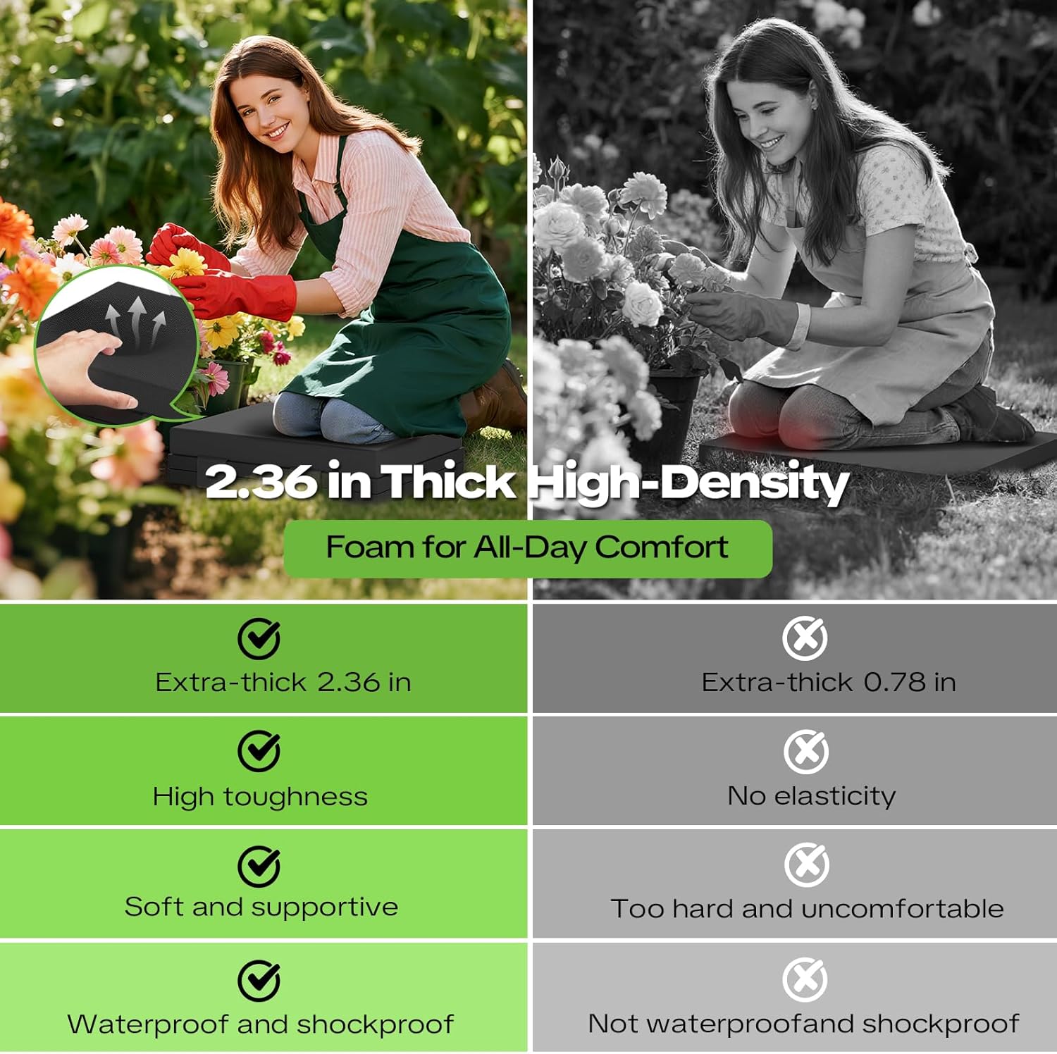 - ăThick & Wide PadăMade with premium foam, this double-sided kneeling pad comes with a removable thick seat cushion, offering a 10.6-inch wide and 2.4-inch thick for extra comfort and knee protection.
