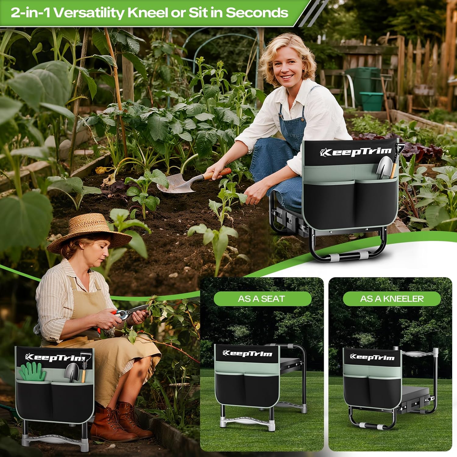 - ă2-in-1 Garden Kneeler & Seată Easily switch between a kneeling pad and a heavy duty garden seat. Provides support and protection for knees and back during prolonged outdoor gardening. A perfect gardening stools for seniors to enjoy or tend their garden comfortably.