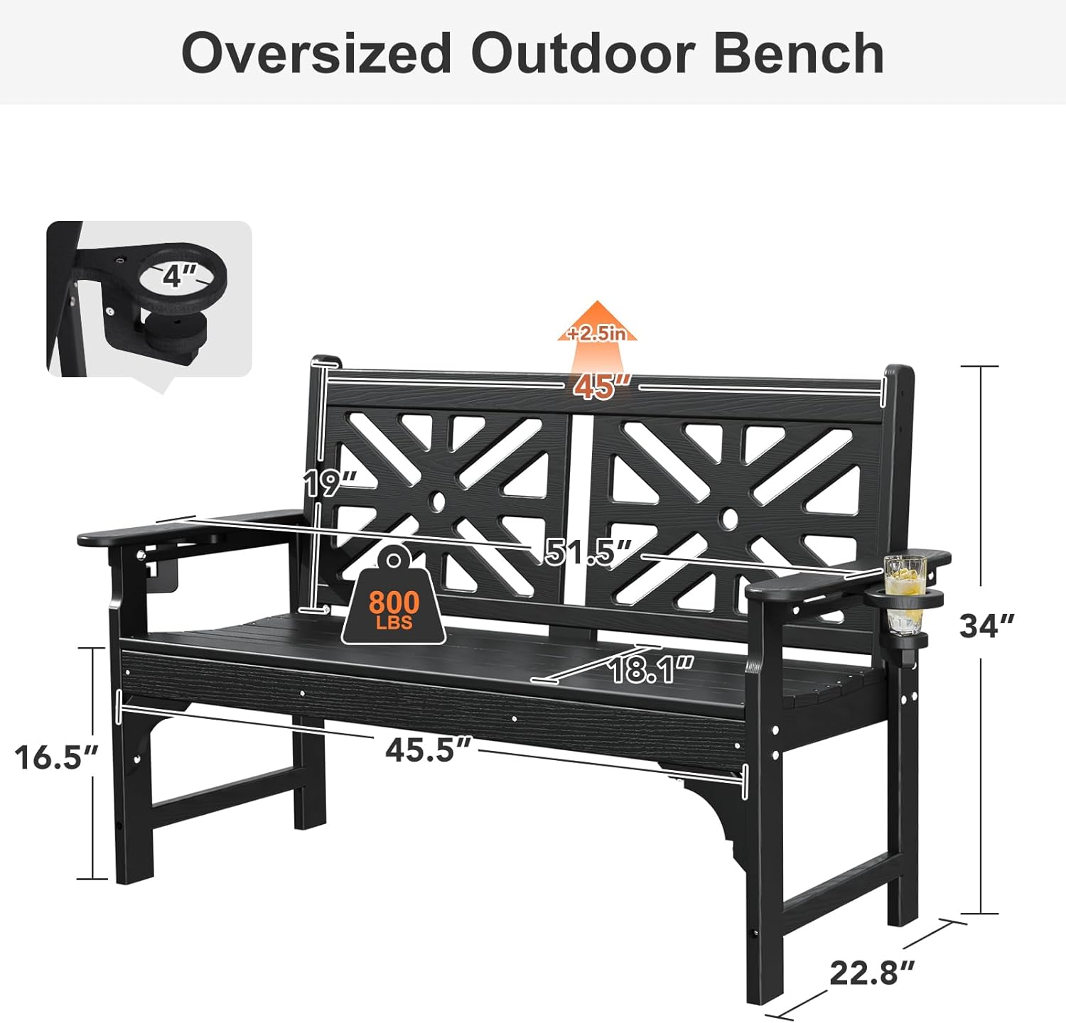 - 【Oversized Outdoor Bench】The dimension of this garden bench is 51.5’L x 22.8’W x 34’H. The widened seat and back are spacious enough to provide sufficient support for 2 people at the same time. Besides, the convenient armrests and cup holders on both sides care for your arms and drinks.