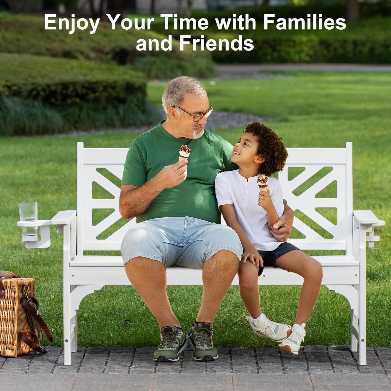 Oversized Outdoor Bench with Cup Holders, 51.5” HDPE Aesthetic Garden Bench for 2 Person, Memorial Benches - Easy Assembly & All Weather, for Porch & Patio, 800lbs Load Capacity (White, 1pc)