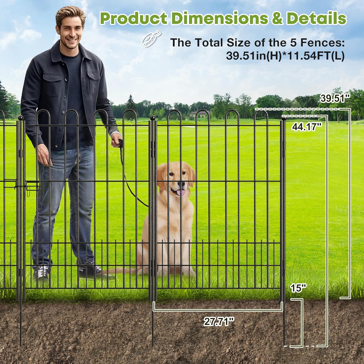 - 【Expandable Metal Fence Panels】 This fence set includes 5 individual panels plus a latch gate. Each panel measures 39.51in (H) X 27.71in(W), with a total assembled length of 11.54ft. The fencing panels are designed to connect seamlessly—whether you’re using them to define garden borders or create outdoor animal containment, you can easily adjust and expand the fence to fit your specific needs
