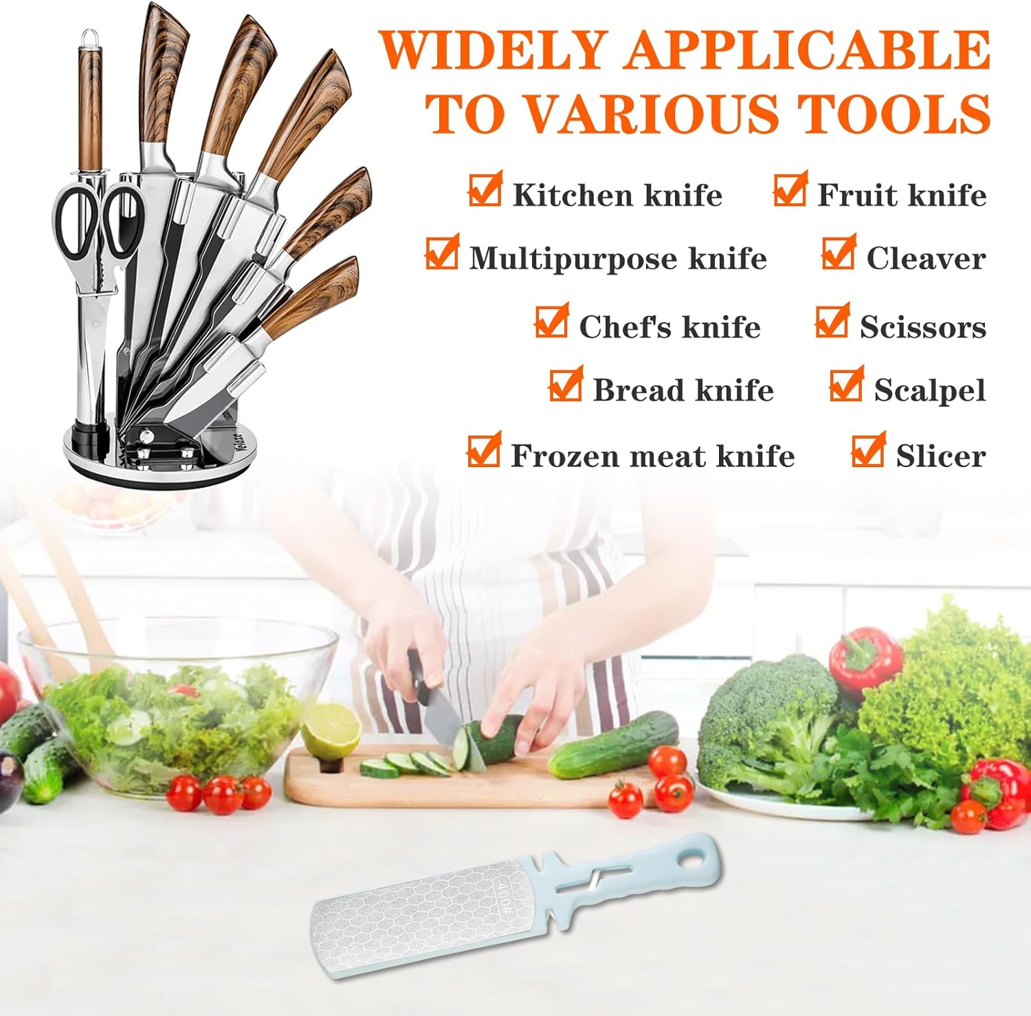 - Convenient to Use:Unlike other whetstones that require soaking and waiting a long time, with our diamond sharpener stones you can sharpening immediately without any preparation! If you need to sharpen knife continuously for a long time, please sprinkle some water continuously to cool it down and prevent overheating from damaging the blade. Dry the sharpening stone water to prevent rust after the work.