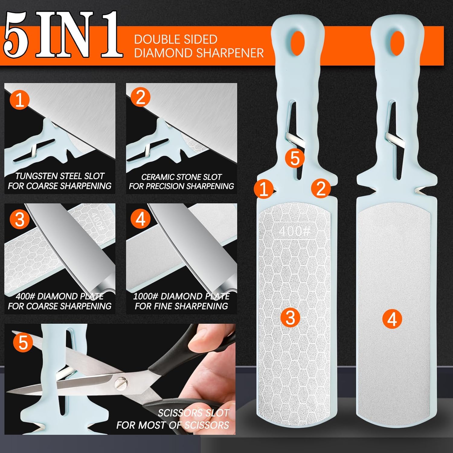 - 5 in 1 Sharpening Stone:The front side 400# coarse sharpening is used to repair severely dulled blades, and back side 1000# fine sharpening is used to re-sharpen the edges and deburr the blade. The lightning slot in middle of handle is for Scissors Grinding. Left waist of the handle is tungsten steel blade sharpens to restore the knife's V-shape,and the right waist of the handle is ceramic blade sharpens for polish and eliminates burrs on the metal blade.