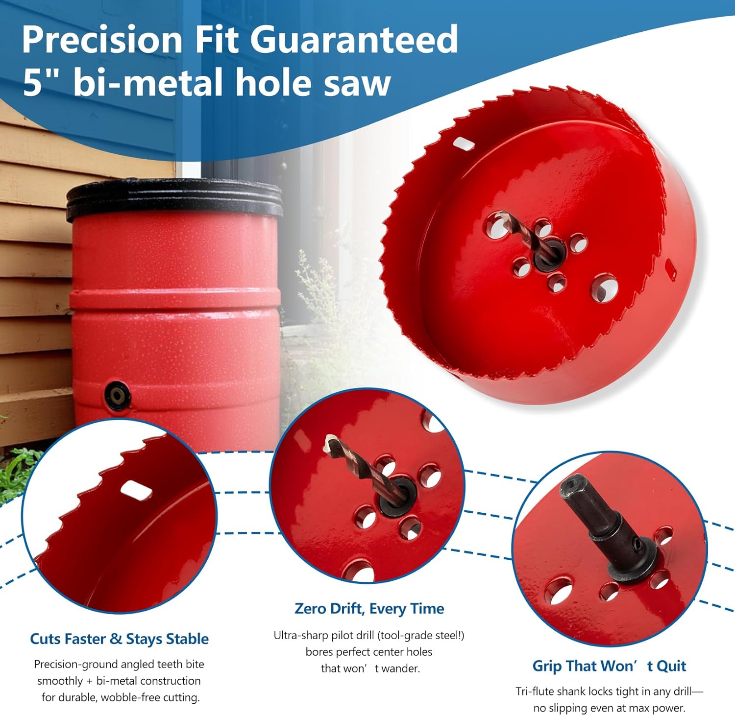 - 【Precision Installation Kit】Includes custom-sized 5" hole cutterguaranteeing perfect fit of the rain barrel screen—zero sizing errors.hole saw is made of high-speed steel Bi-Metal construction, high hardness, durable and rust-proof.