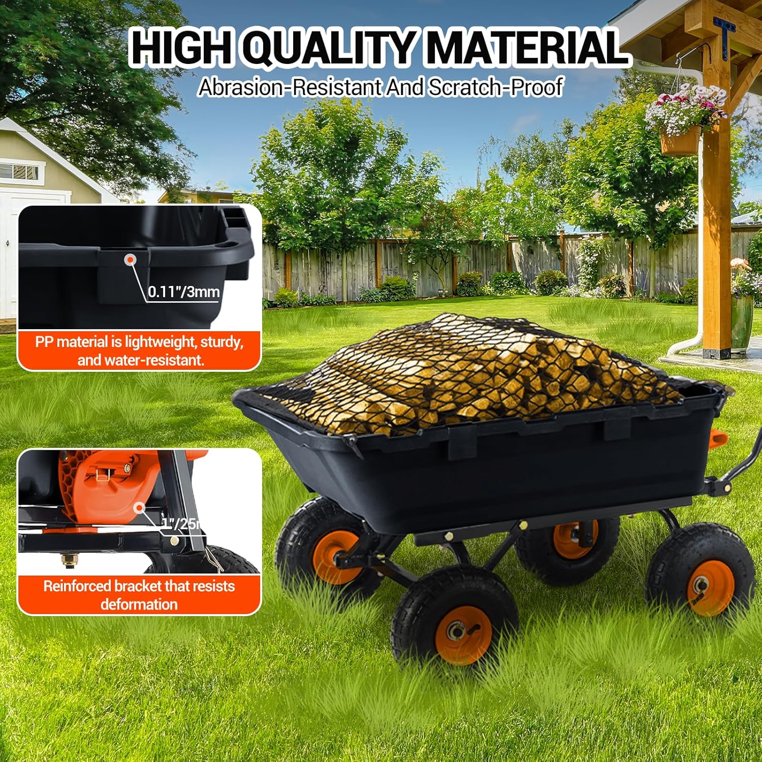 - HIGH-QUALITY CONSTRUCTION: Made from premium 0.11"/3mm thick polypropylene material, this yard dump wagon maintains its shape under heavy loads. It is reinforced with 25mm/1" metal brackets and coated with a scratch-resistant finish for superior durability, perfect for outdoor use.