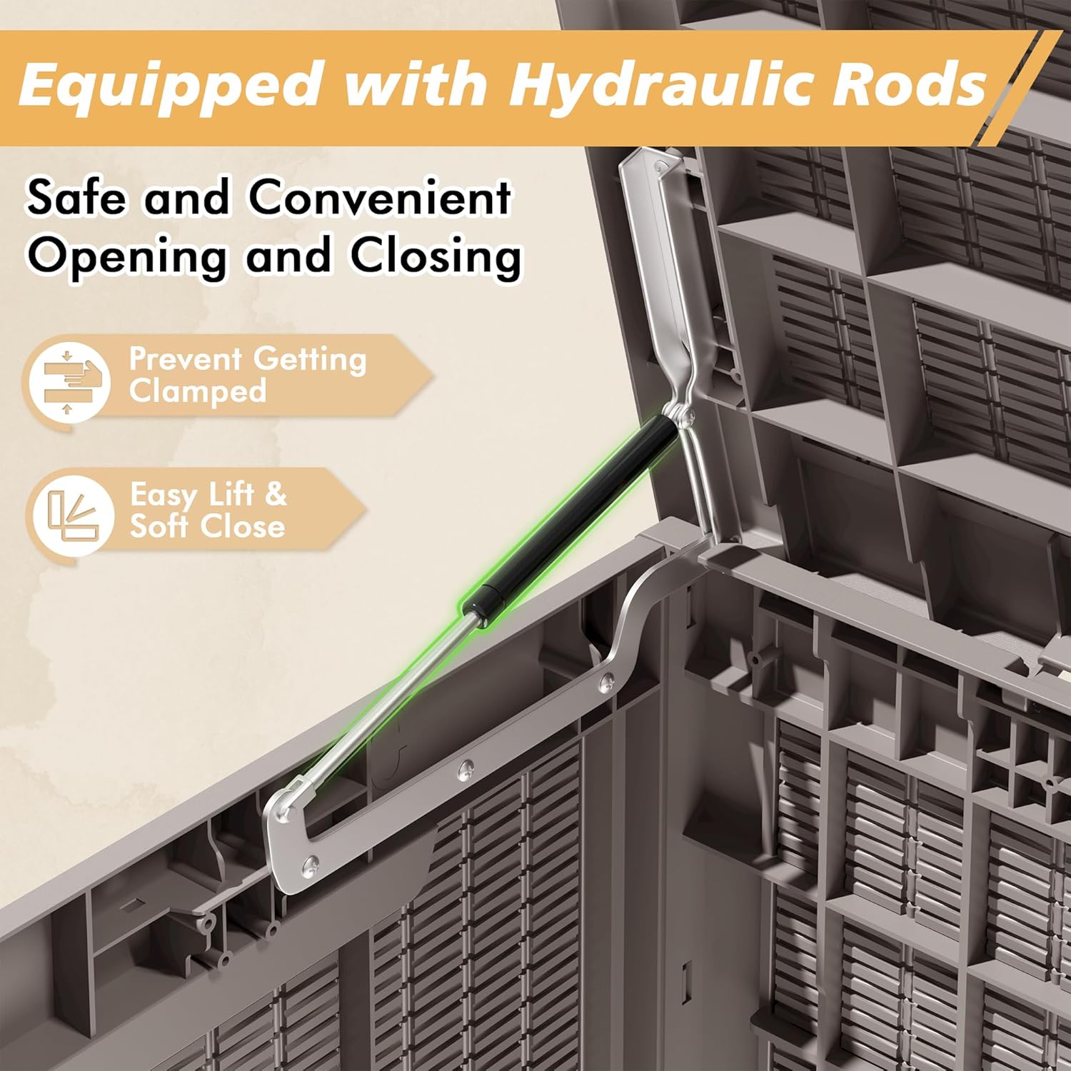 - 👍 Hydraulic Lid with Lockable Design for Safe Access Equipped with hydraulic gas lift rods, the lid opens smoothly and closes gently to prevent pinched fingers. The lockable lid adds an extra layer of security, making it an ideal choice for shared outdoor spaces or secure backyard storage. (Lock not included)