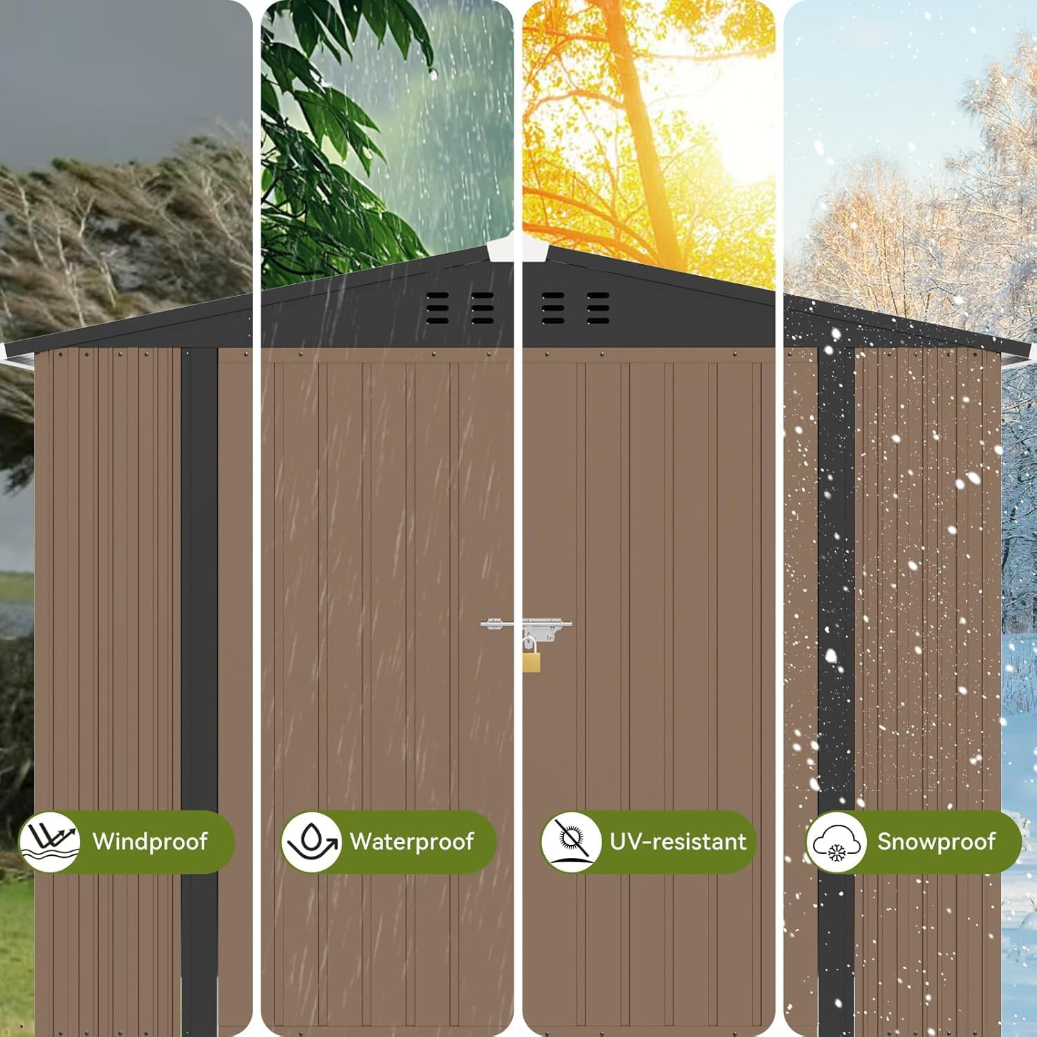 - Outdoor Shed:This storage shed is made of high-quality galvanized steel and covered with a powder-coated finish.Its durable construction ensures that it can withstand harsh weather conditions and ensure your items remain safe