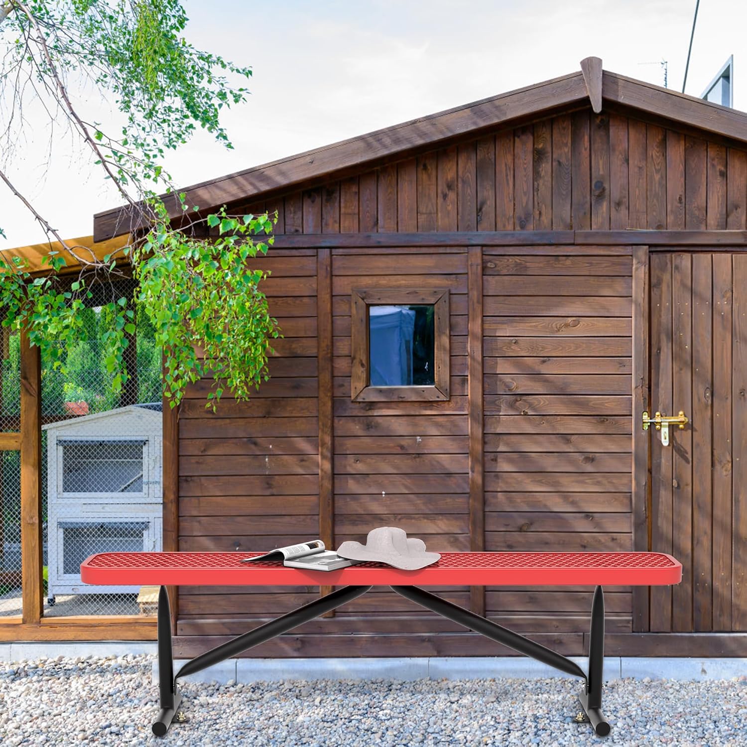 6 Feet Heavy Duty Metal Park Bench for Outside, Outdoor Bench with Portable Frame, Commercial Benches for Shopping Mall, Store, Park, Patio, Deck, Red