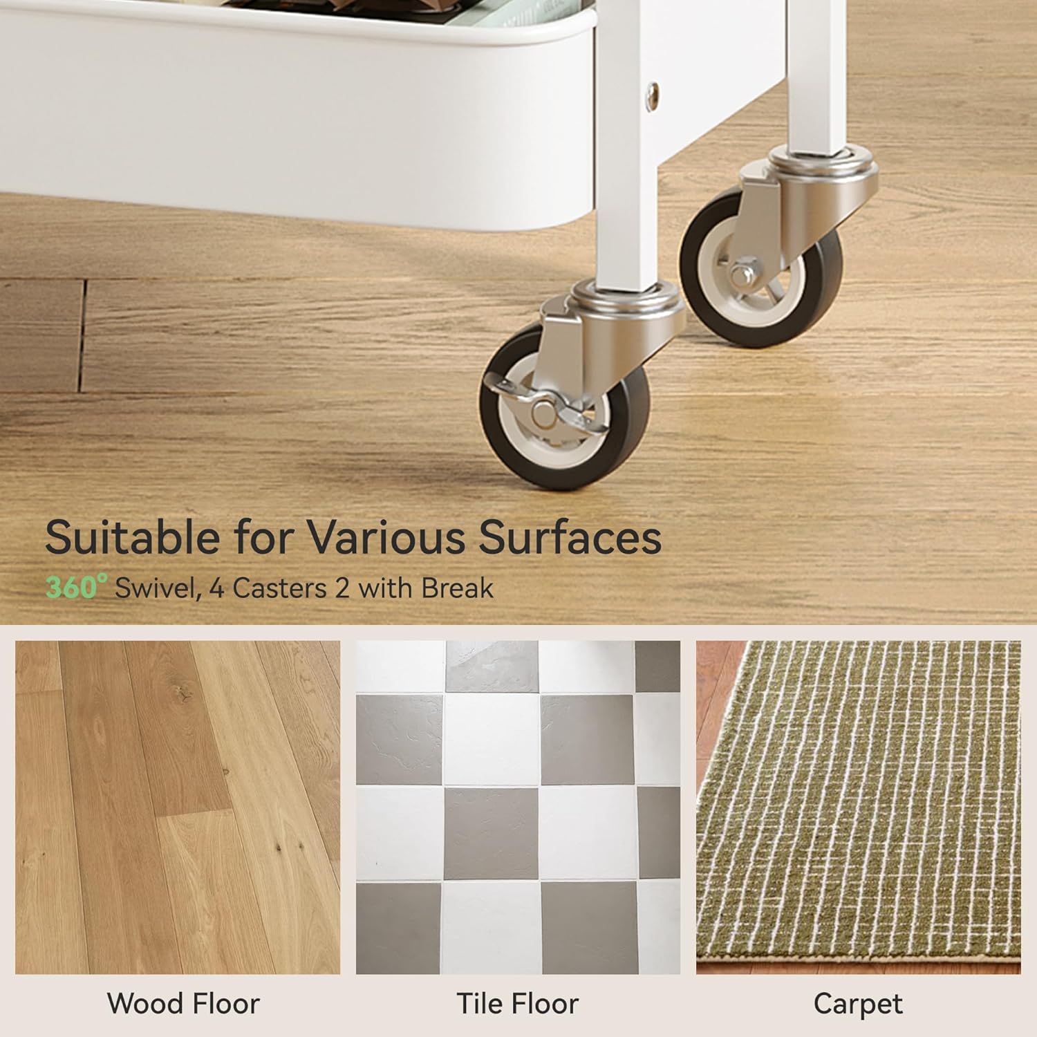 - Smooth-Gliding 360 Degrees Wheels with Locking Brakes: Effortlessly maneuver your utility cart over hardwood, tile, and carpet with four swivel casters. Two wheels feature locking brakes to secure your storage cart safely in place, preventing accidents and providing stability during use. Move and stop with total control