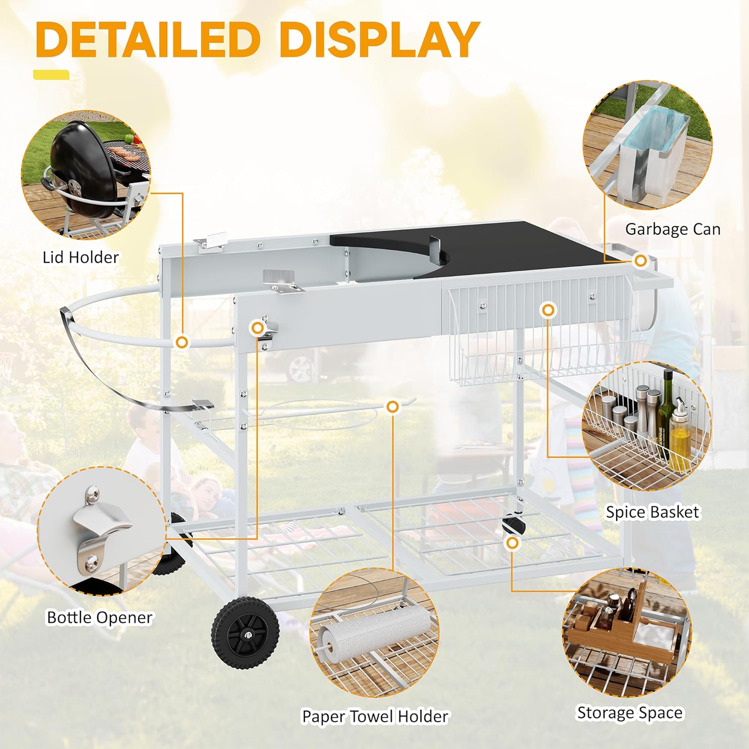 - Lockable Wheels for Easy Mobility: The cart comes with four durable all-weather wheels, sliding smoothly across various surfaces. Two lockable wheels provide stability during use, keeping your Weber grill table securely in place while cooking, letting you focus on grilling delicious food without distractions.