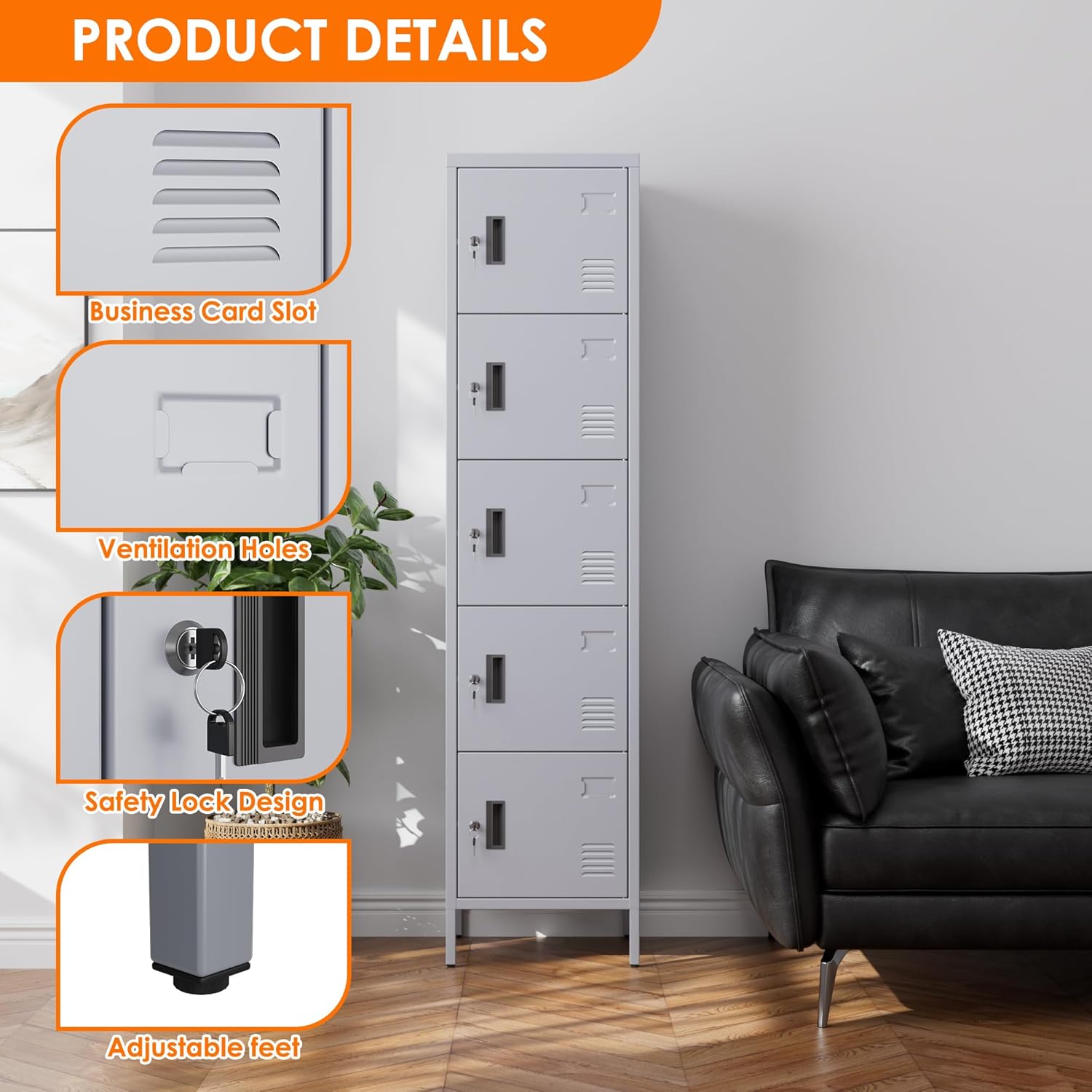 - Air Vents and Adjustable Feet : Steel locker doors are equipped with ventilation holes, which help you keep items dry and ventilated.We have installed four adjustable feet,you can adjust its height according to your needs
