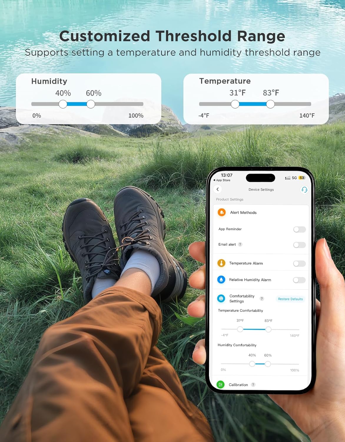 - Smart Alerts: This outdoor digital thermometer supports both app monitoring and standalone display. You can connect via Bluetooth for preset temp./humid. thresholds and receive instant alerts via the app when values exceed the range. Or view the data directly on the screen. (Currently only supports 197ft Bluetooth remote viewing)