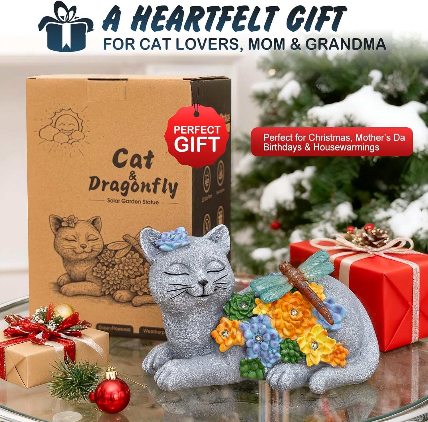Solar Cat Garden Statue - Lying Outdoor Figurine with Dragonfly & Flower LEDs, Upgraded 2.0 Solar, Auto On/Off, IP65 Waterproof Hand-Painted Resin, Garden Decor, Gift for Cat Lovers, Mom, Grandma