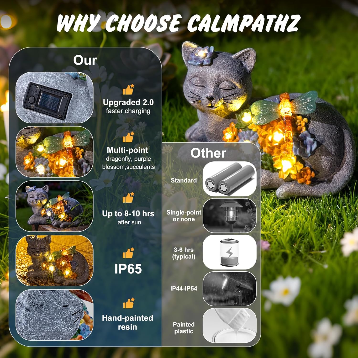 - Gift-Ready Lying Cat with Multi-Point Glow: Adorable outdoor cat figurine in a peaceful lying pose—features a glowing dragonfly, succulent flowers, and a purple blossom on the head, plus an independent mini solar light to accent paths and flower beds. A delightful garden decor and a heartfelt gift for cat lovers, Mom, Grandma—perfect for Mother’s Day, birthdays, housewarming, Christmas