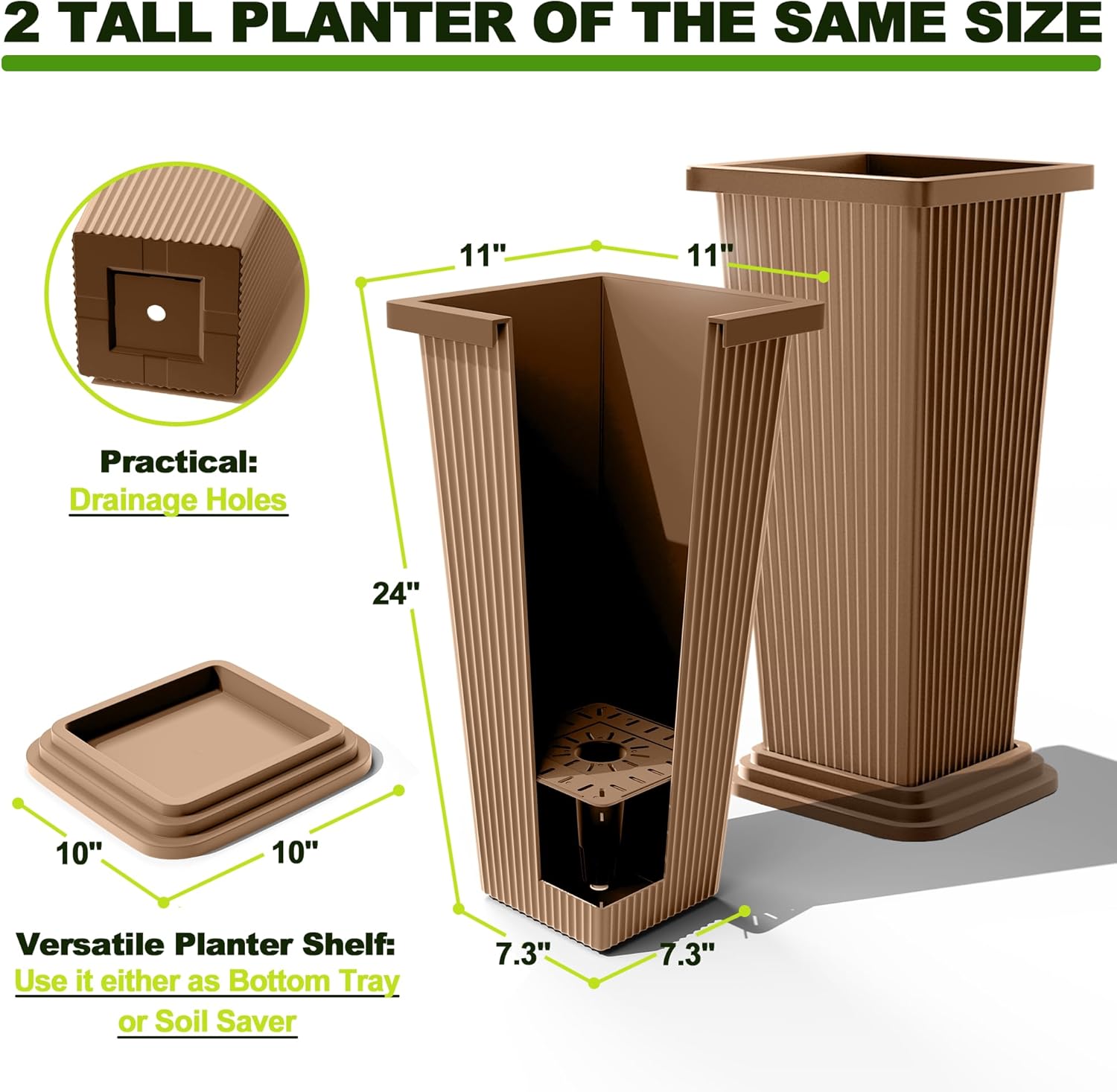 FENCY Set of 2 Tall Planters for Outdoor Plants, 24 Inch Large Tapered Pots with Drainage Trays, Weather-Resistant Plastic Plant Containers for Patio, Porch, Garden, Front Door Decor,Brown, Striped