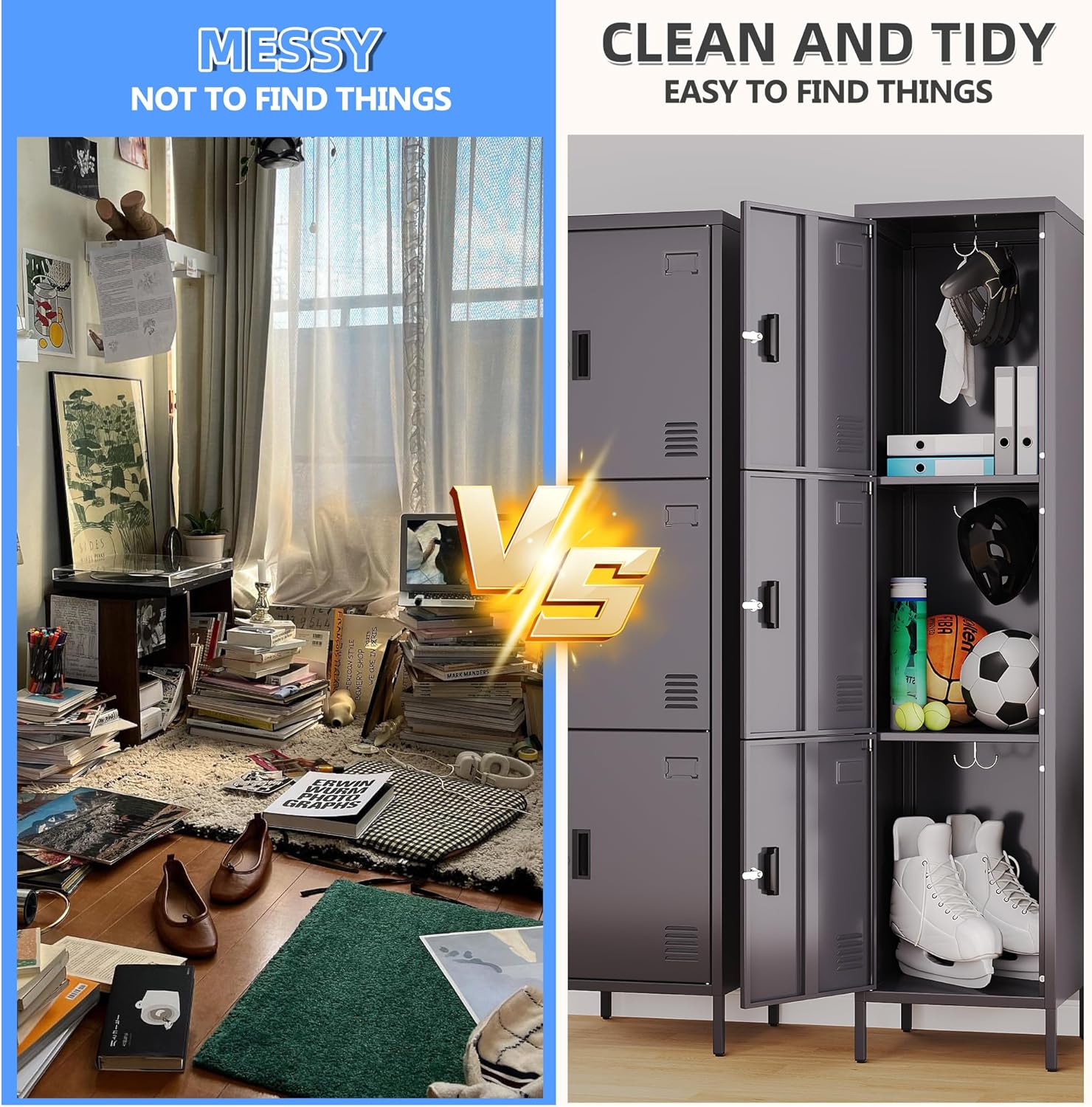 - 3 Lockable& Magnetic Doors: There is employee locker has 3 doors which can be locked separately.What's more,the key to each door are not universal,it can be used by 3 people respectively. The door of this storage locker is also designed with magnetic suction, which can keep it closed even when it is not locked, not only ensuring the safety of the items but also keeping it tidy.