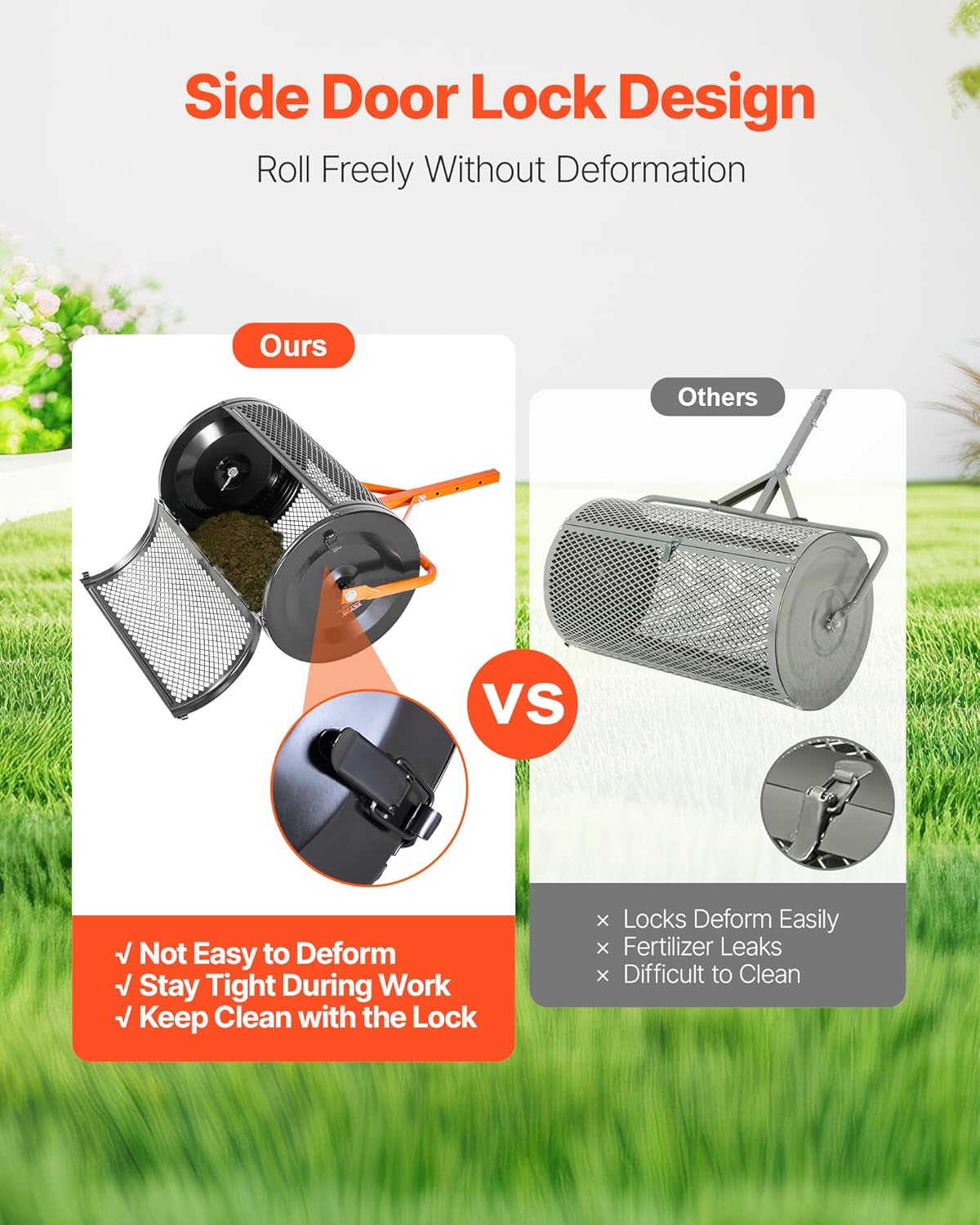 - Large Capacity Drum: The 24-inch peat moss roller holds up to 2.66 cubic feet of material, reducing the need for frequent refills. Load it once with grass seed, compost, or soil conditioner to cover large areas quickly and easily.