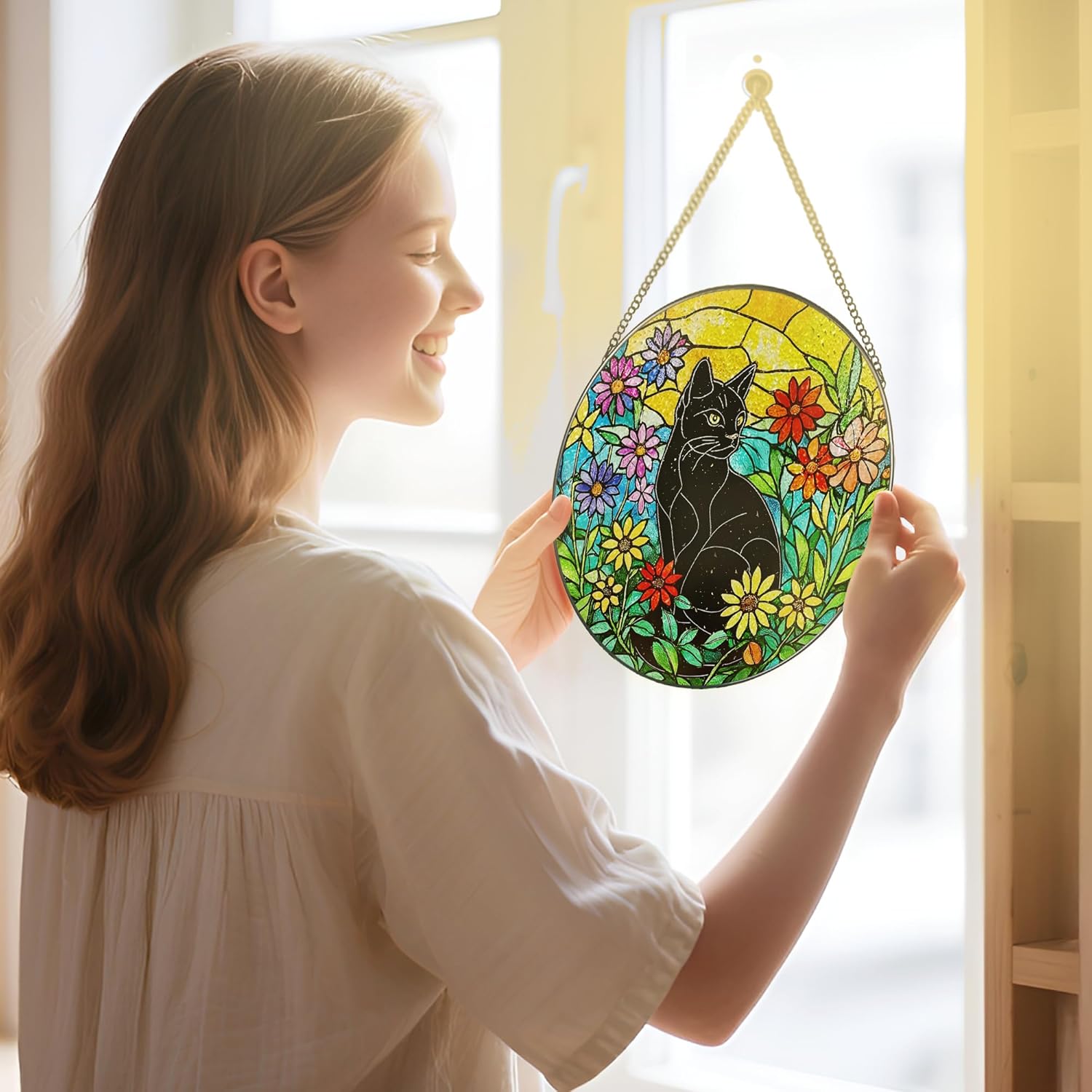 Black Cat Stained Glass Window Hanging, 8 Inch Sun Catchers Indoor Window, Suncatchers for Windows Hanging, Home Decor and Christmas, Festival, Mother's Day, Birthday, Gifts for Women, Men, Cat Lovers