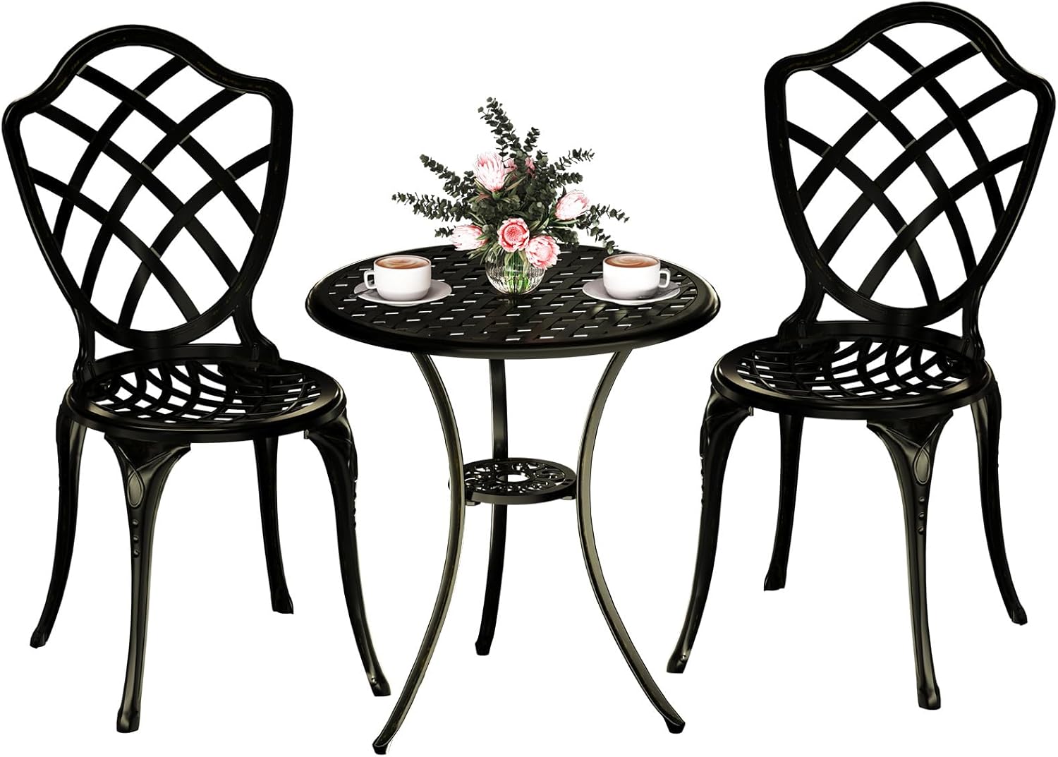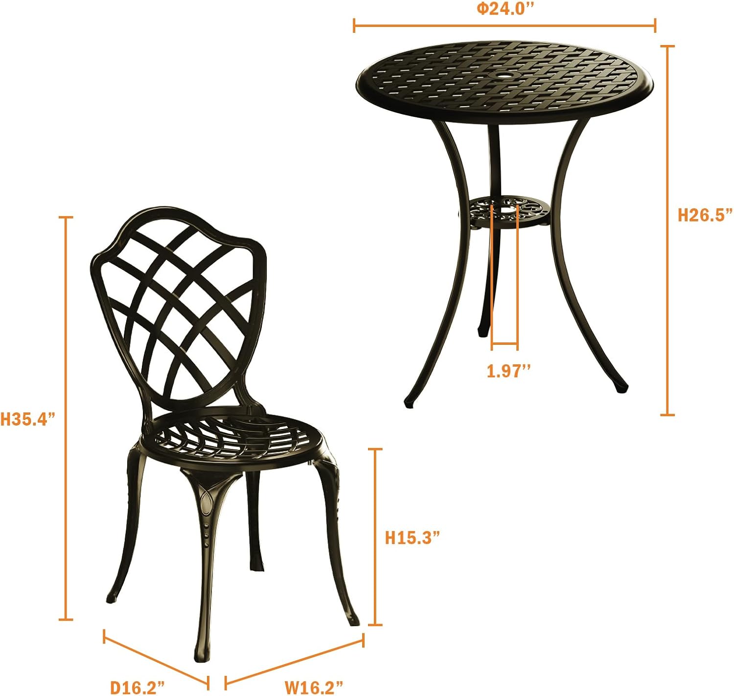 - ăDurable Cast AluminumăMade of anti-rust, weather-resistant cast aluminum, making bistro set perfect for long-term outdoor use in any climate