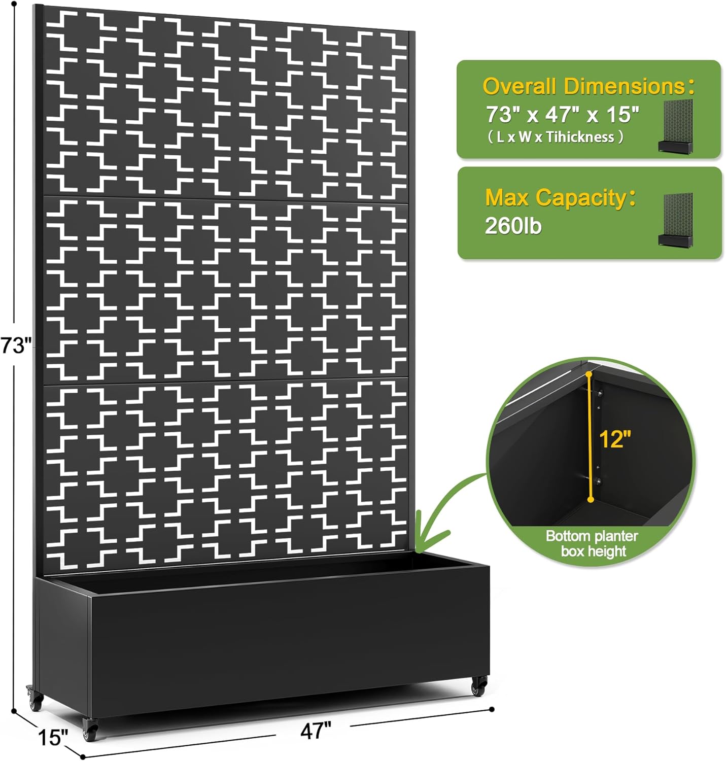 FENCY Metal Raised Garden Bed with Wheels and Trellis,73"x47"x16" Planter Box for Climbing Plants, Vegetables & Vines, Features Privacy Screen and Drainage Holes (Black-Square)