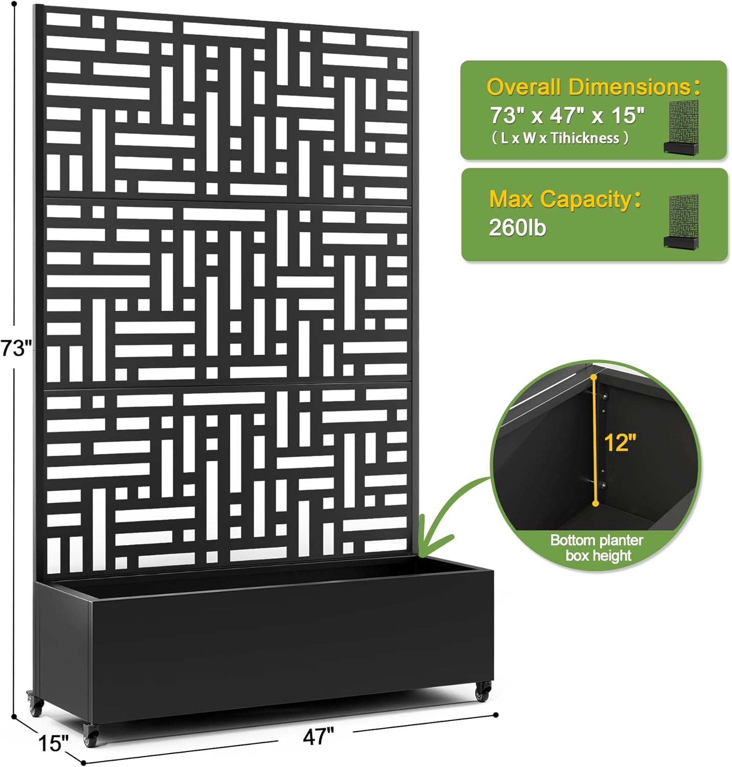 FENCY Metal Raised Garden Bed with Wheels and Trellis,73"x47"x16" Planter Box for Climbing Plants, Vegetables & Vines, Features Privacy Screen and Drainage Holes (Black-Geometric Lattice)