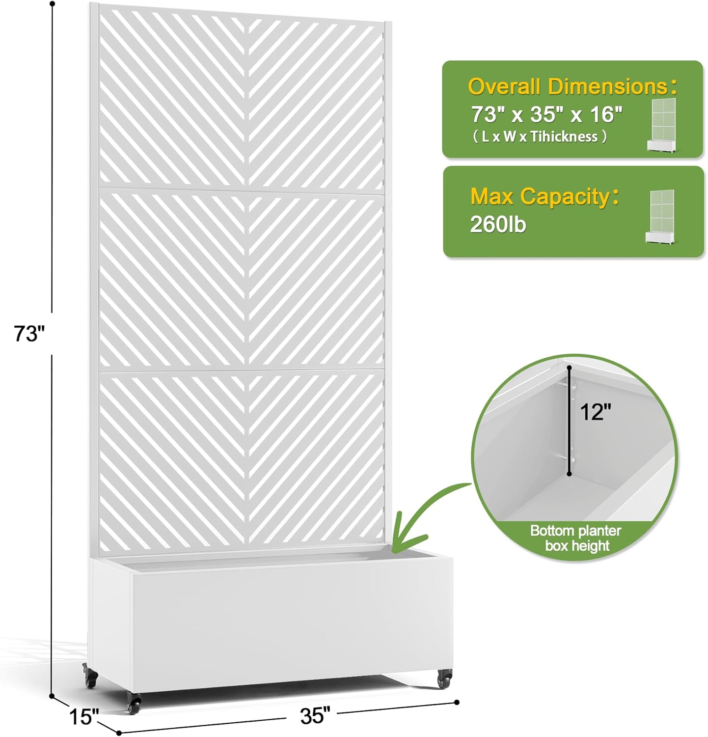 FENCY Metal Raised Garden Bed with Wheels and Trellis,73"x35"x16" Planter Box for Climbing Plants, Vegetables & Vines, Features Privacy Screen and Drainage Holes (White-Arrow)