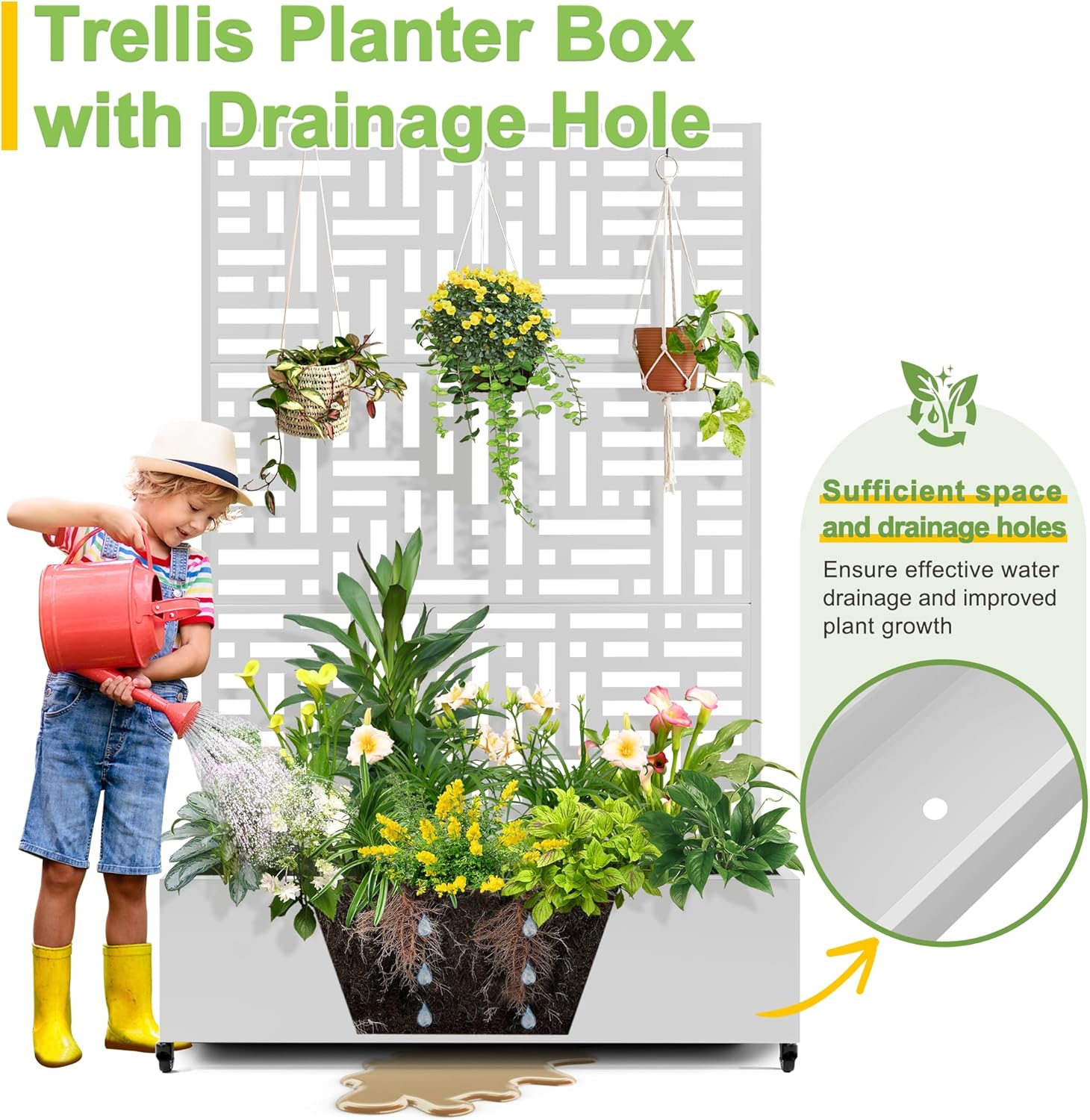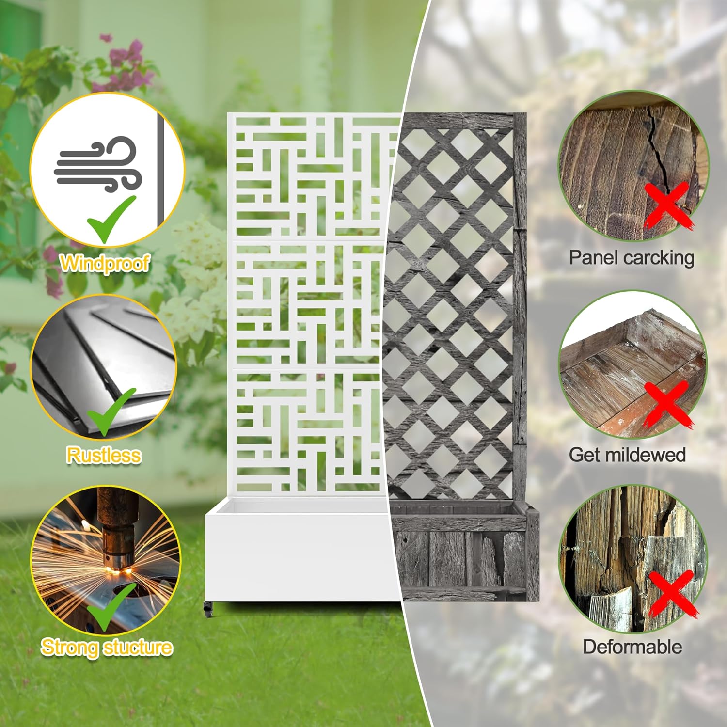 FENCY Metal Raised Garden Bed with Wheels and Trellis,73"x47"x16" Planter Box for Climbing Plants, Vegetables & Vines, Features Privacy Screen and Drainage Holes (White-Geometric Lattice)