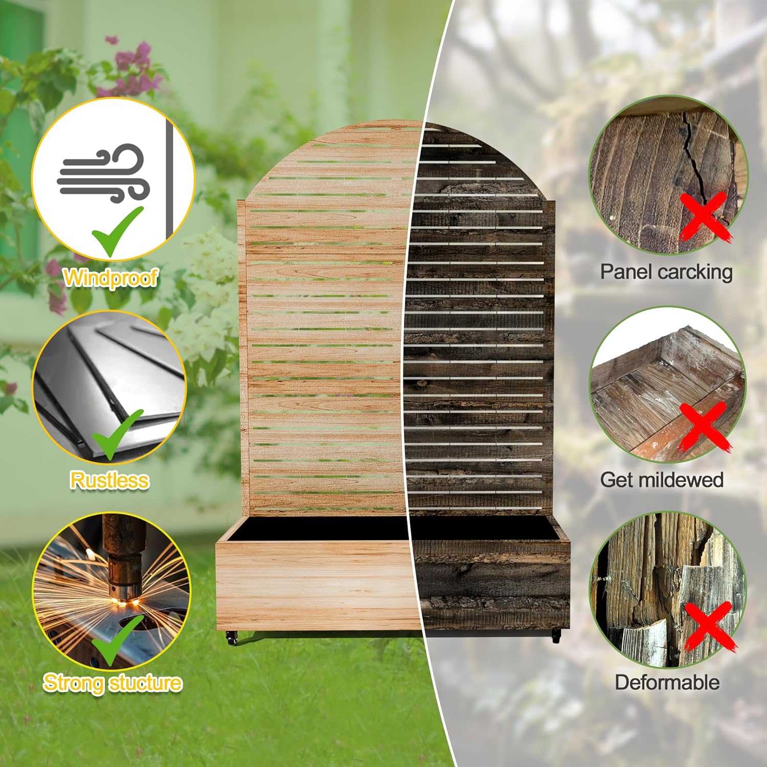 FENCY Metal Raised Garden Bed with Wheels and Trellis,Arched 73"x47"x16" Planter Box for Climbing Plants, Vegetables & Vines, Features Privacy Screen and Drainage Holes (Acacia Wood Finish)
