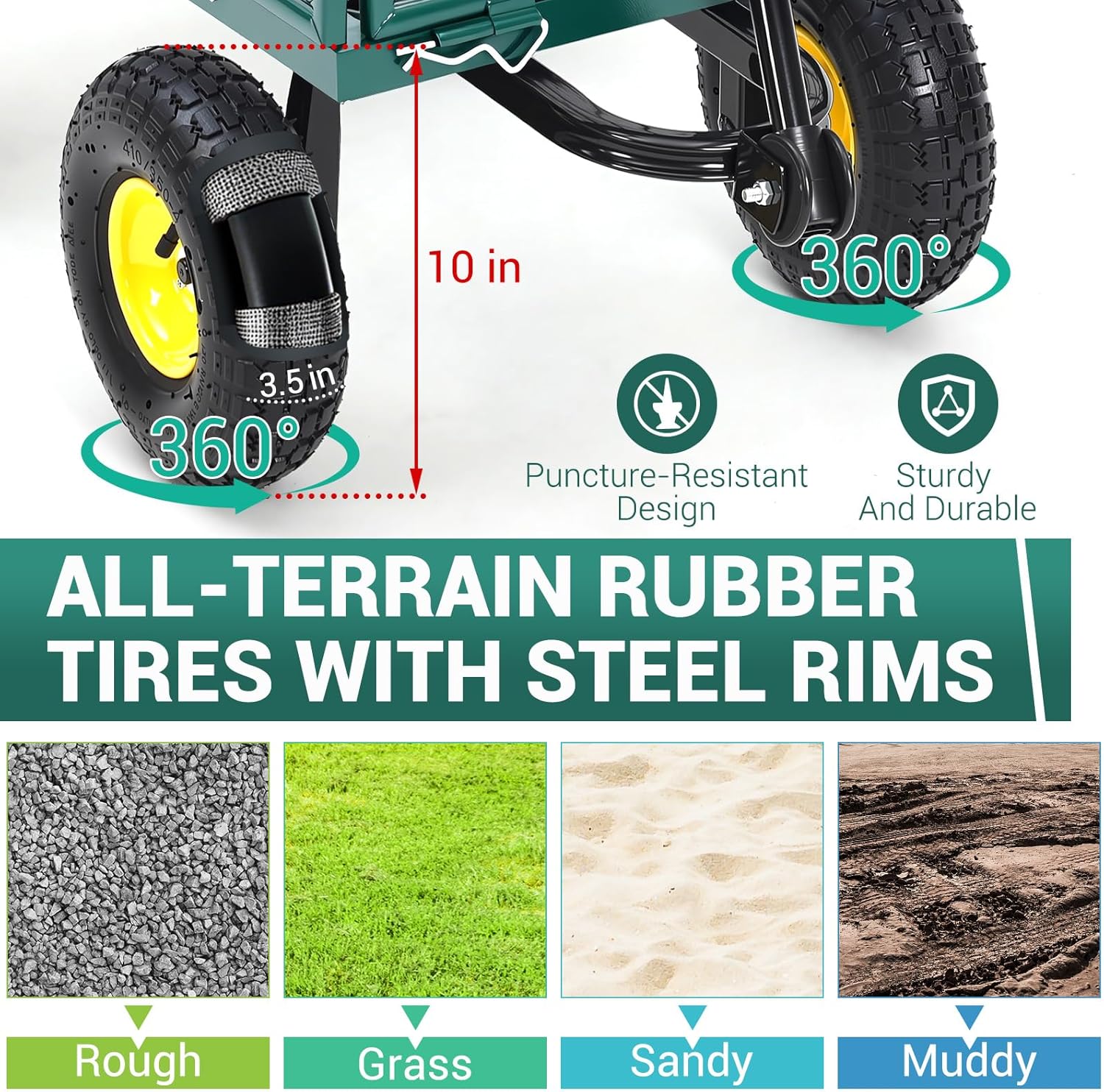 - USER-FRIENDLY SWIVEL HANDLE: The cart is equipped with a 180-degree swivel handle for easier maneuvering. The handle has a rubberized grip, which increases operating comfort and reduces fatigue during prolonged use. This thoughtful design allows you to navigate through tight spaces and corners with ease, making gardening more efficient.