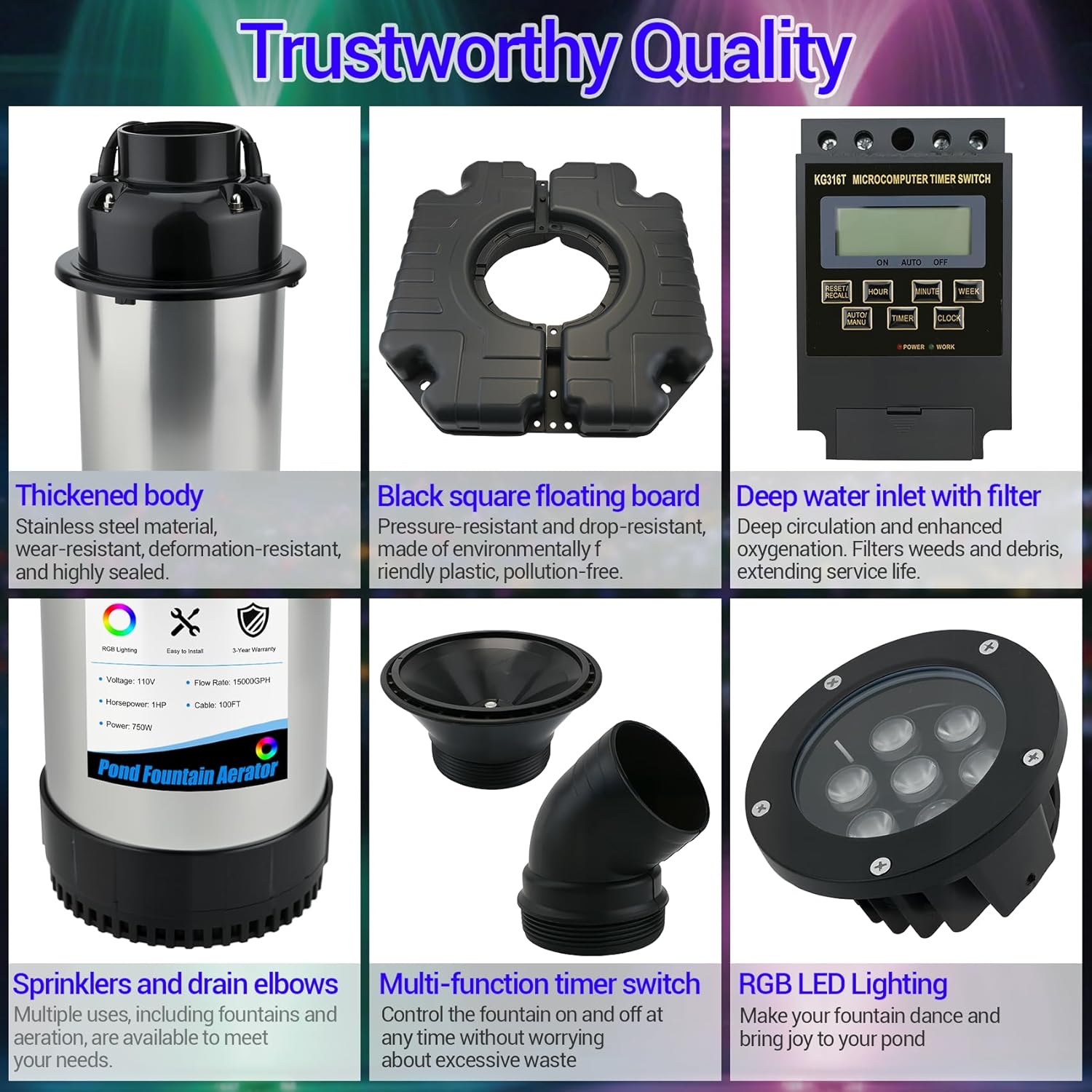 - [Powerful Performance]: Our 1HP 110V lake aerator fountain is suitable for ponds, fishponds, and lakes of all sizes. This floating pond aerator boasts a powerful 15,000 gph, 750 watts of power. It also comes with a 100-foot power cord, allowing you to adjust the fountain aerator’s position in the lake as you wish. Combining intelligent technology with efficient aeration, this floating fountain aerator not only improves water quality but also delivers an impressive visual experience.