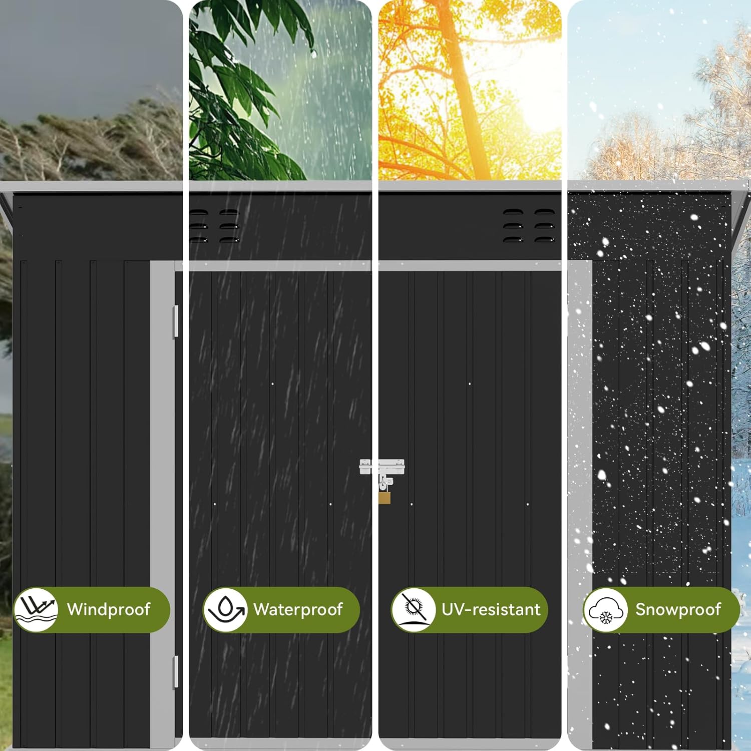 - Outdoor Shed:This storage shed is made of high-quality galvanized steel and covered with a powder-coated finish.Its durable construction ensures that it can withstand harsh weather conditions and ensure your items remain safe
