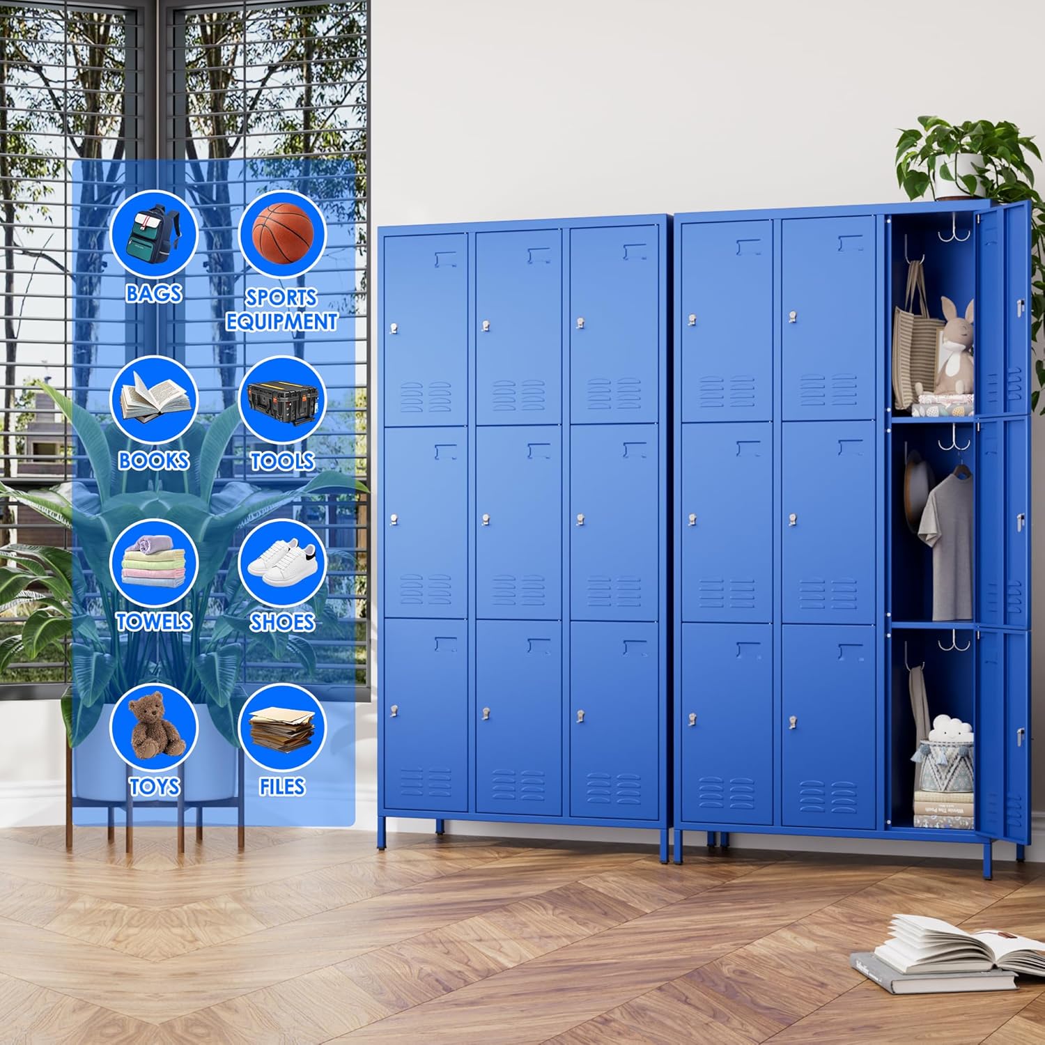 9 Doors Metal Locker for Employees with 27 Hooks and Business Card Holder,Metal Locker with Ventilation Holes for School Garage Office Gym Home,Assembly Required,Blue