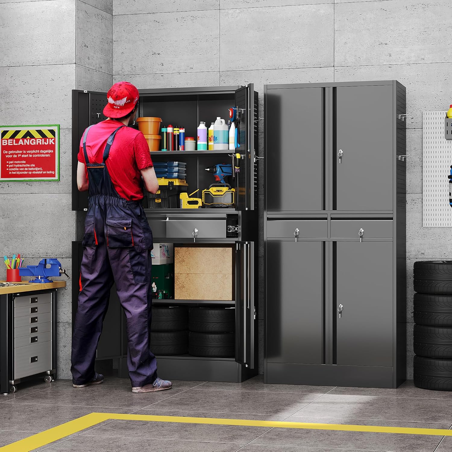 Garage Storage Cabinet, Metal Storage Cabinet with 2 Drawers and 2 Adjustable Shelves, Metal Lockers with Pegboards for Homes, Offices, Kitchens, Schools and Pantries